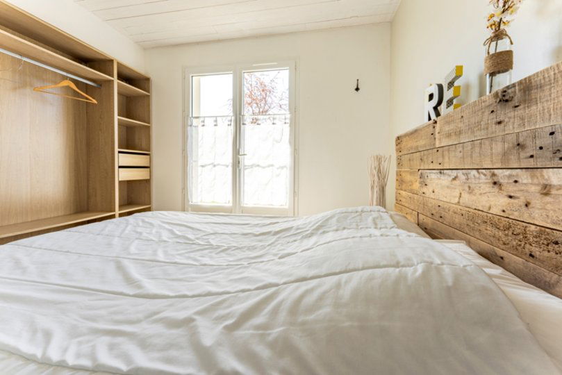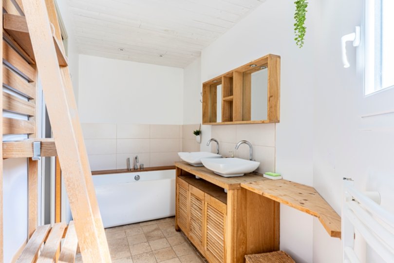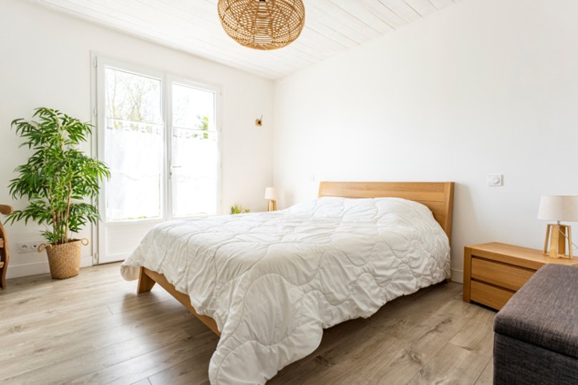 L'espace nuit s'articule avec 4 chambres : 1 chambre double avec salle de bain attenante, une chambre double, une chambre avec 2 lits simples et une chambre "enfants" avec lits superposés et lit simple, ainsi que 2 salles d'eau.