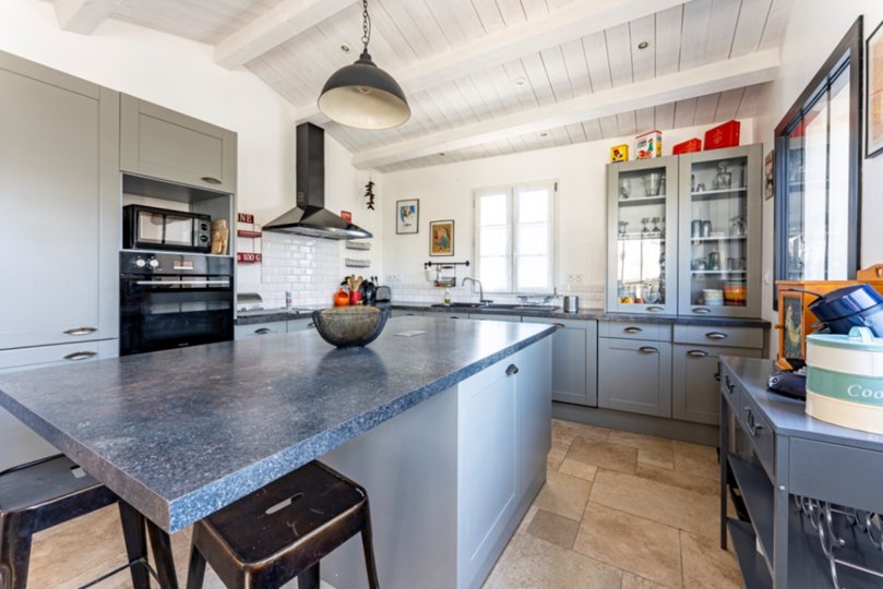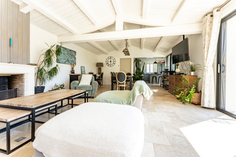 La partie séjour se compose d'une cuisine équipée avec un îlot central, ouverte sur la salle à manger et le coin salon
