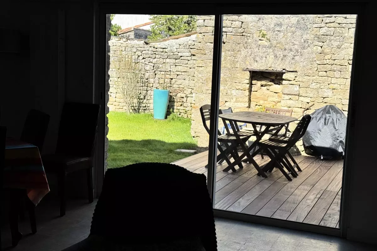 - Une grande pièce à vivre avec un mur en pierre apparente (présence de salpêtre), très claire grâce à une fenêtre de toit et une baie donnant sur le jardin et son puits.