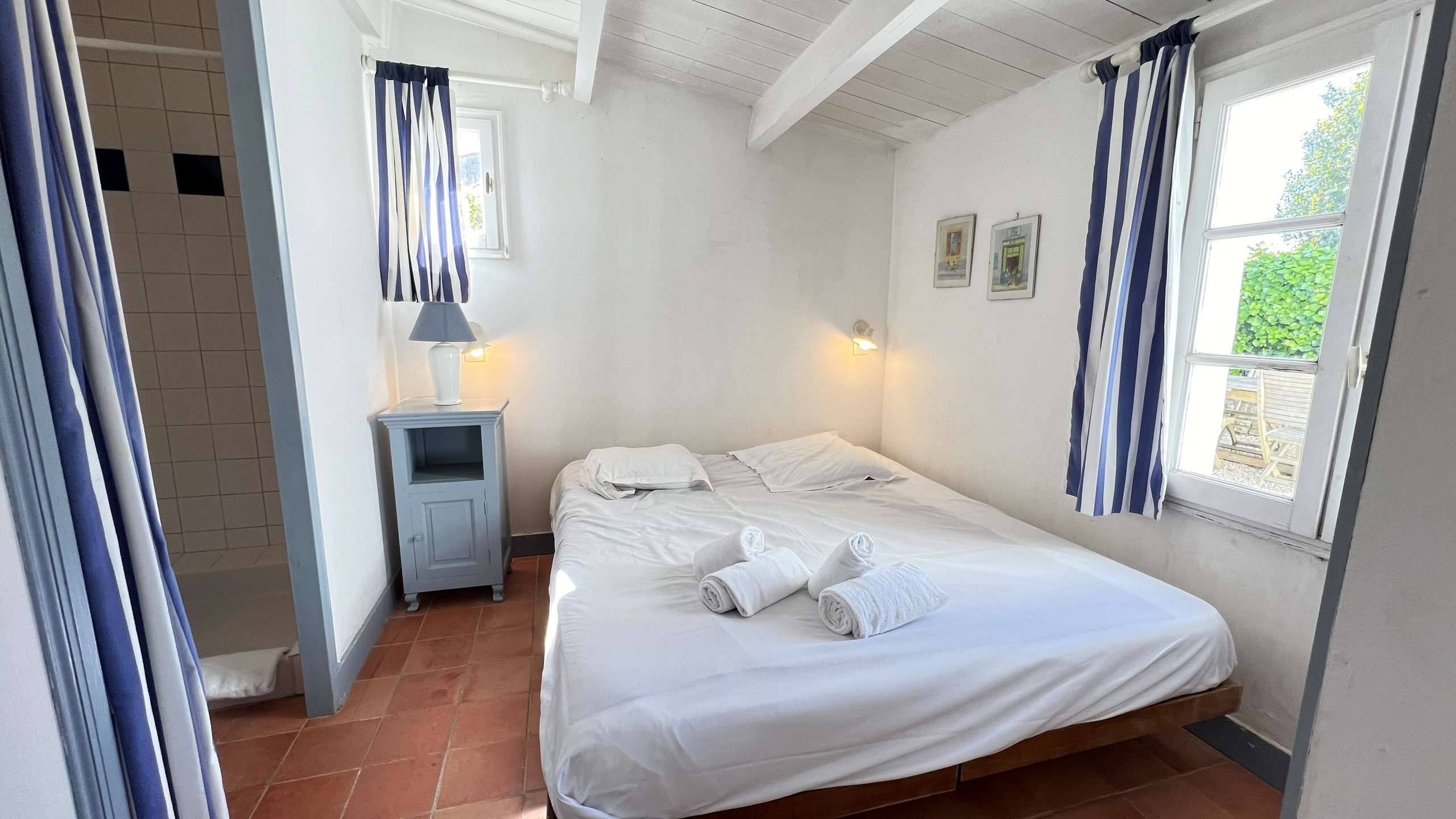 CHAMBRE 1 (Ouest) 10m², 1 lit de 160 , chevets armoire (penderie, étagères). SALLE D'EAU privative avec douche, lavabo, wc.