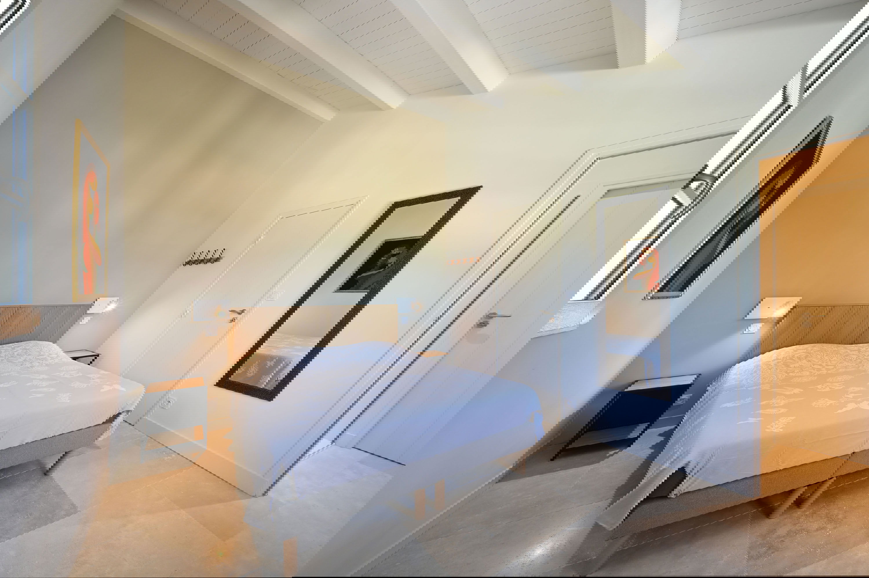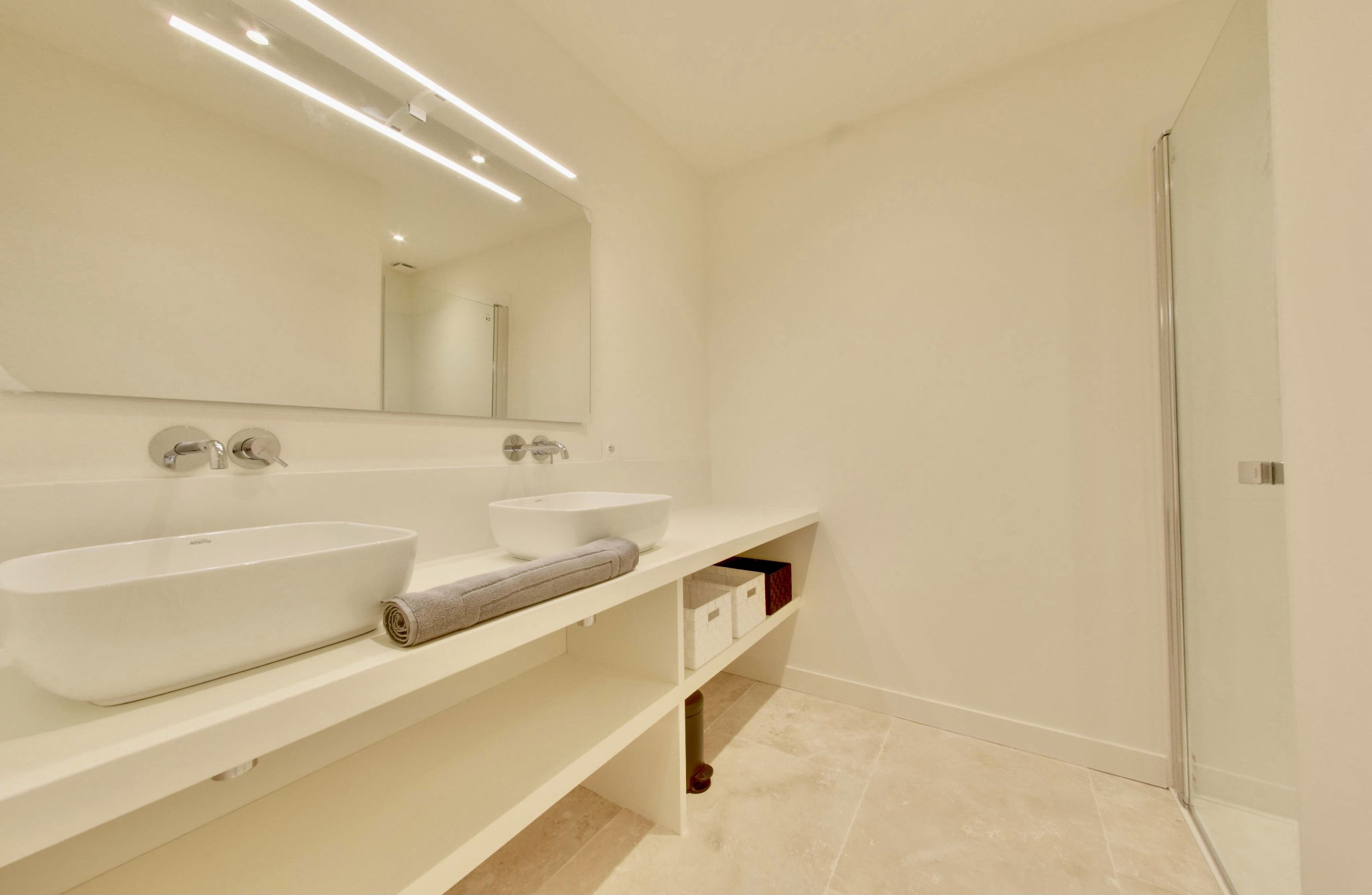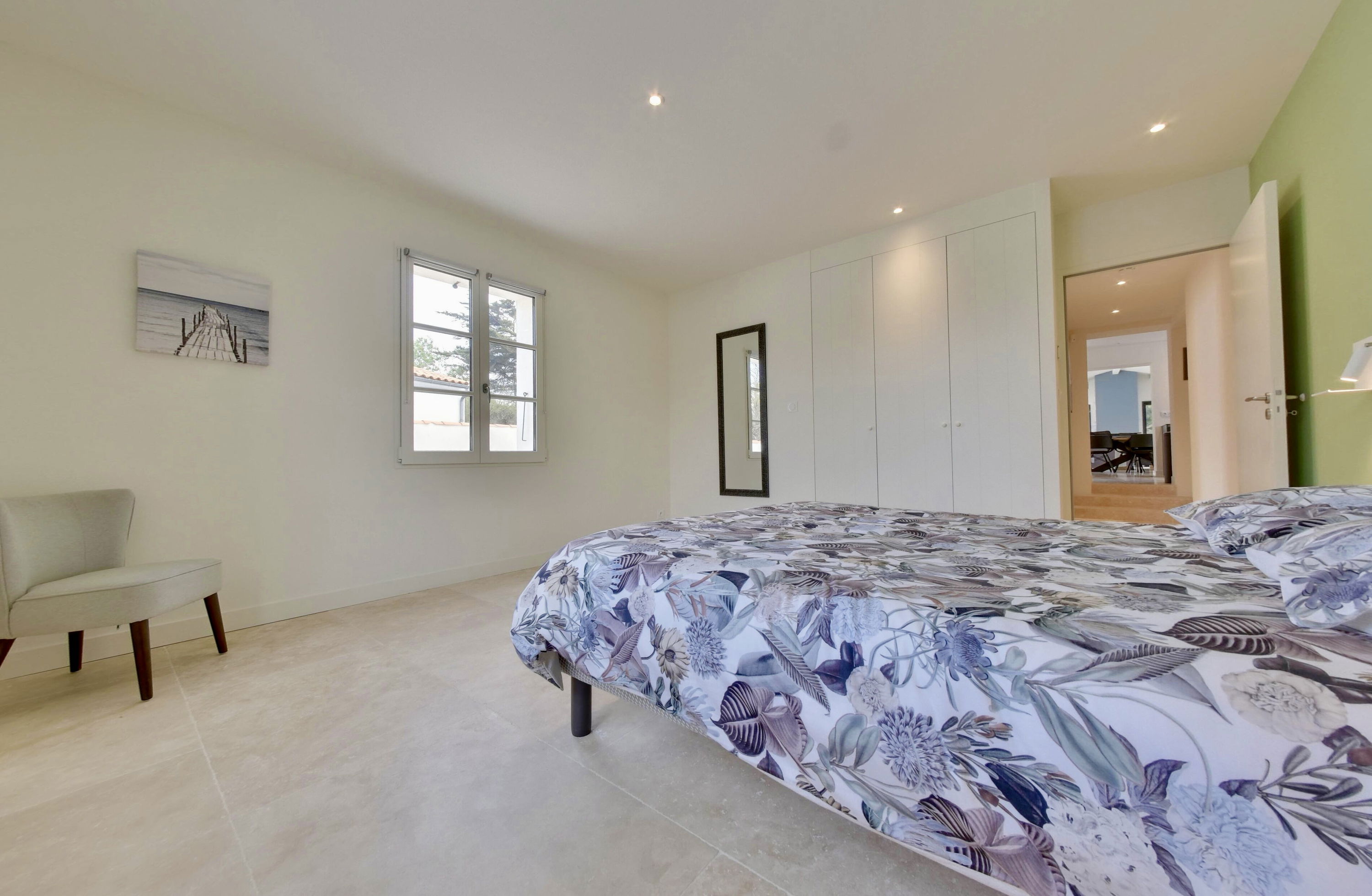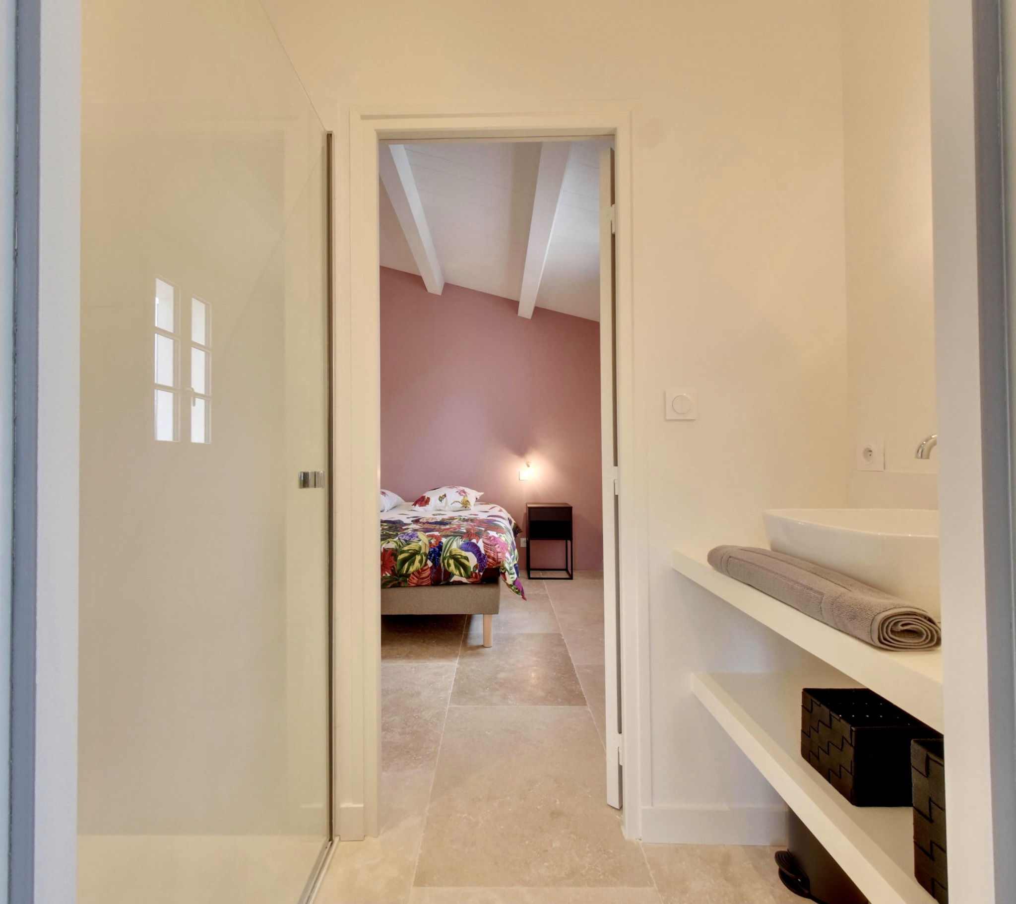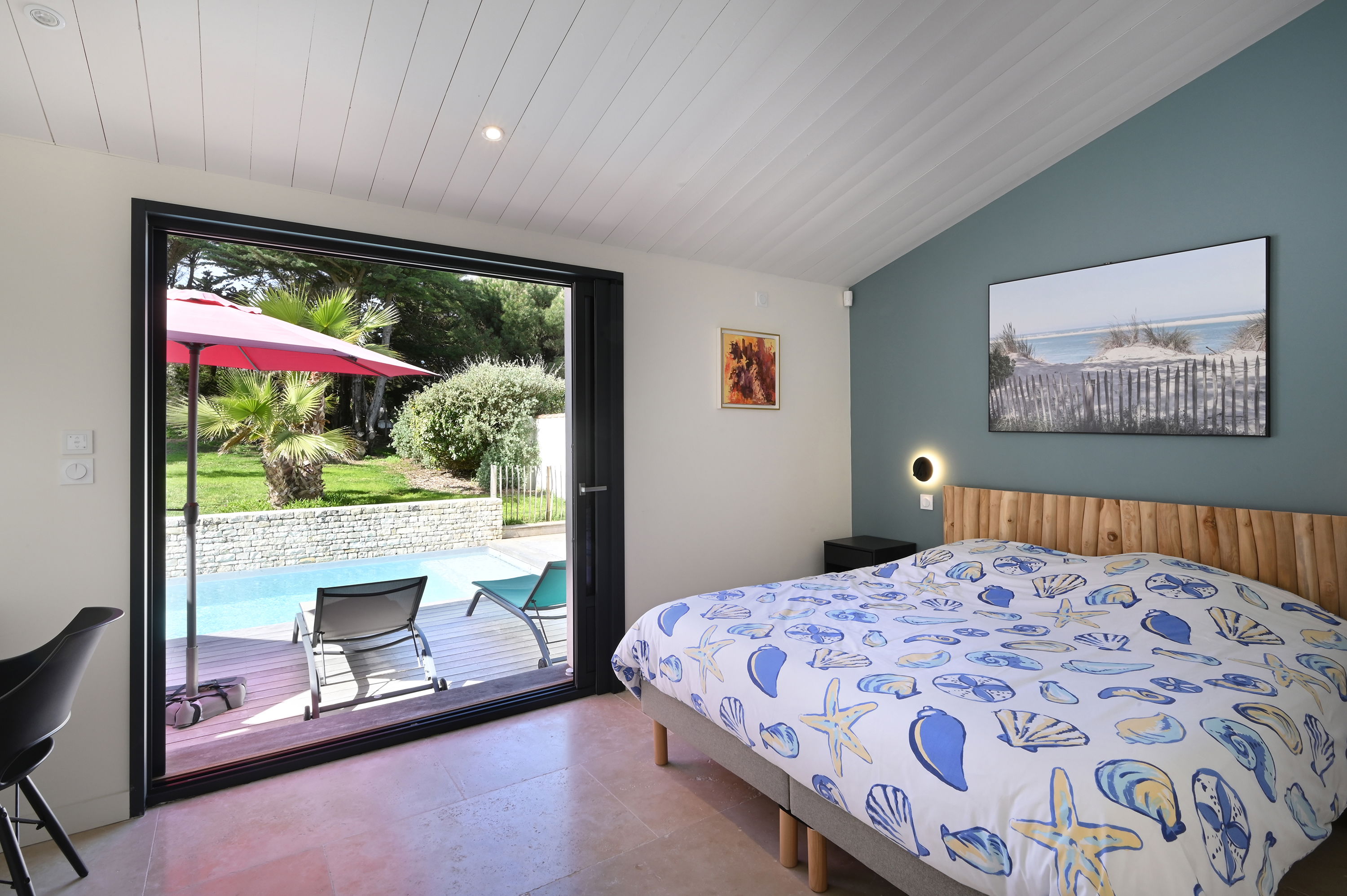 - une première chambre au rez-de-chaussée avec sa salle de bains privative (douche, baignoire, WC) et son accès piscine