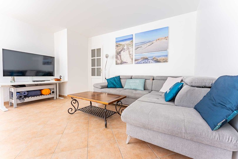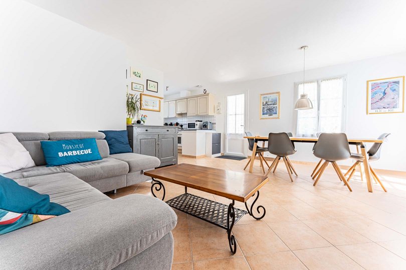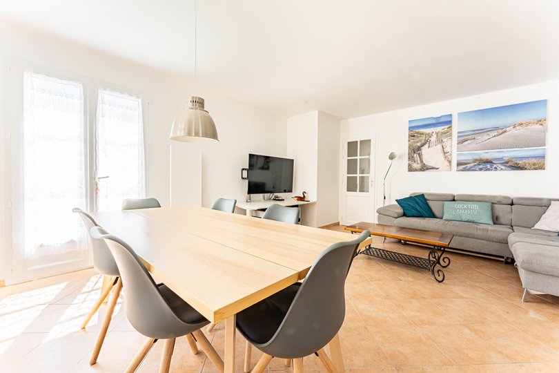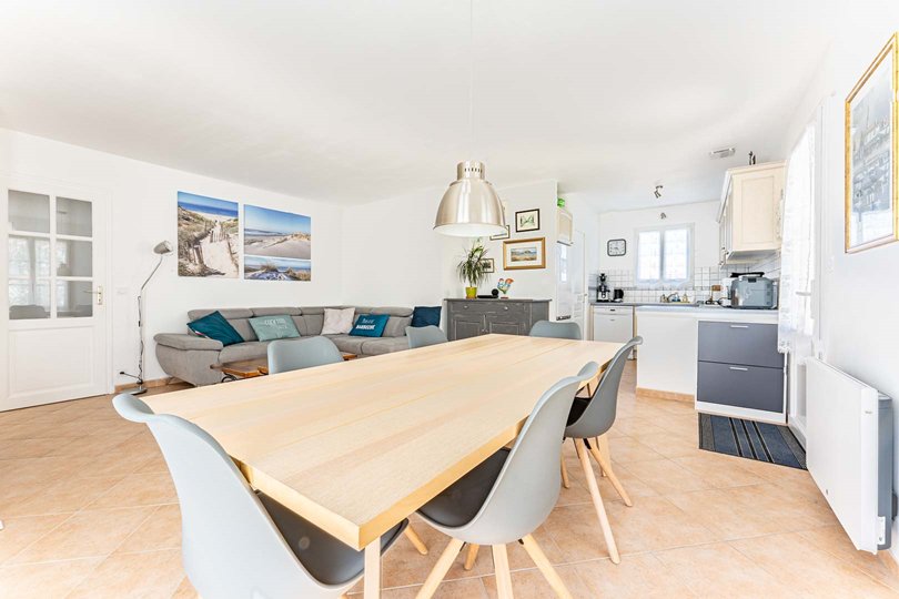 Cette maison de vacances se compose d'un séjour / salle à manger avec une cuisine équipée, offrant un accès direct sur la terrasse et le jardin.
