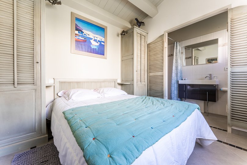 La maison dispose de 3 chambres: une chambre parentale en suite (salle d'eau) avec accès sur l'extérieur, une chambre double avec fenêtre sur la véranda avec accès à une salle de bain indépendante et une troisième chambre double "en suite" dans l'annexe avec salle d'eau