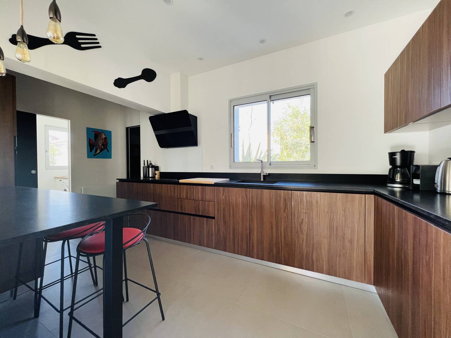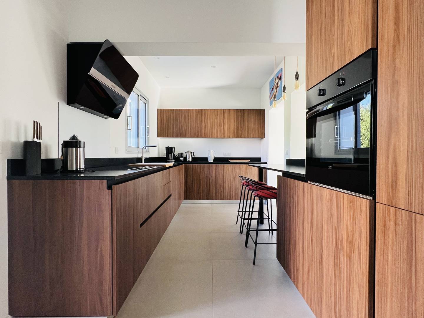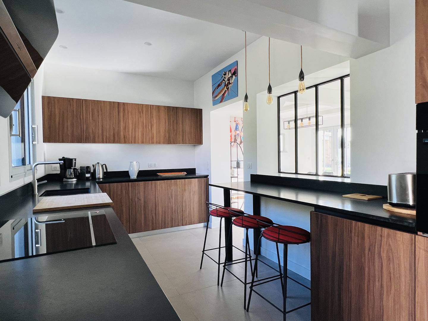 La cuisine est bien équipée avec plaque induction, hotte, four, micro-ondes, lave-vaisselle et réfrigérateur-congélateur.