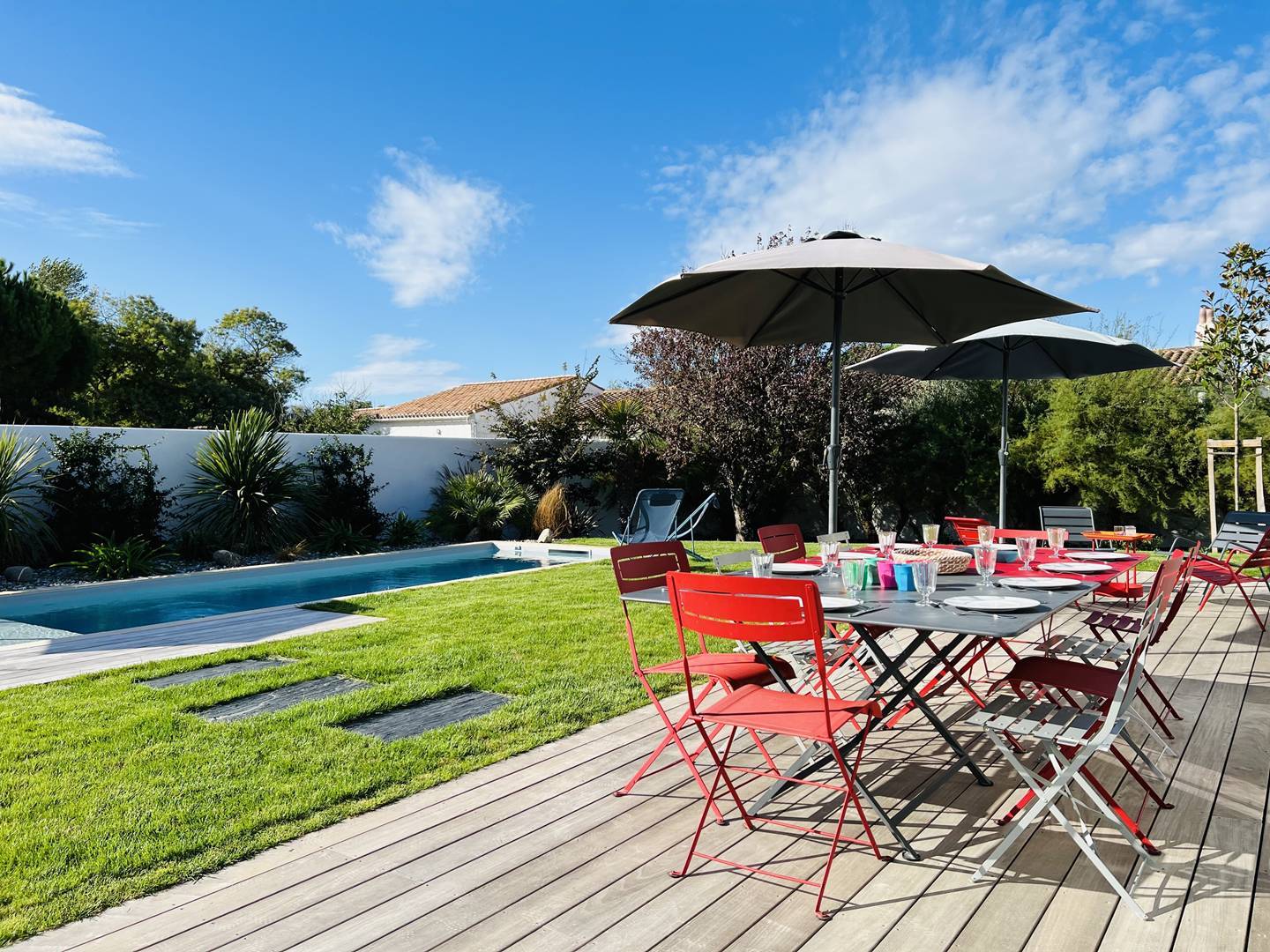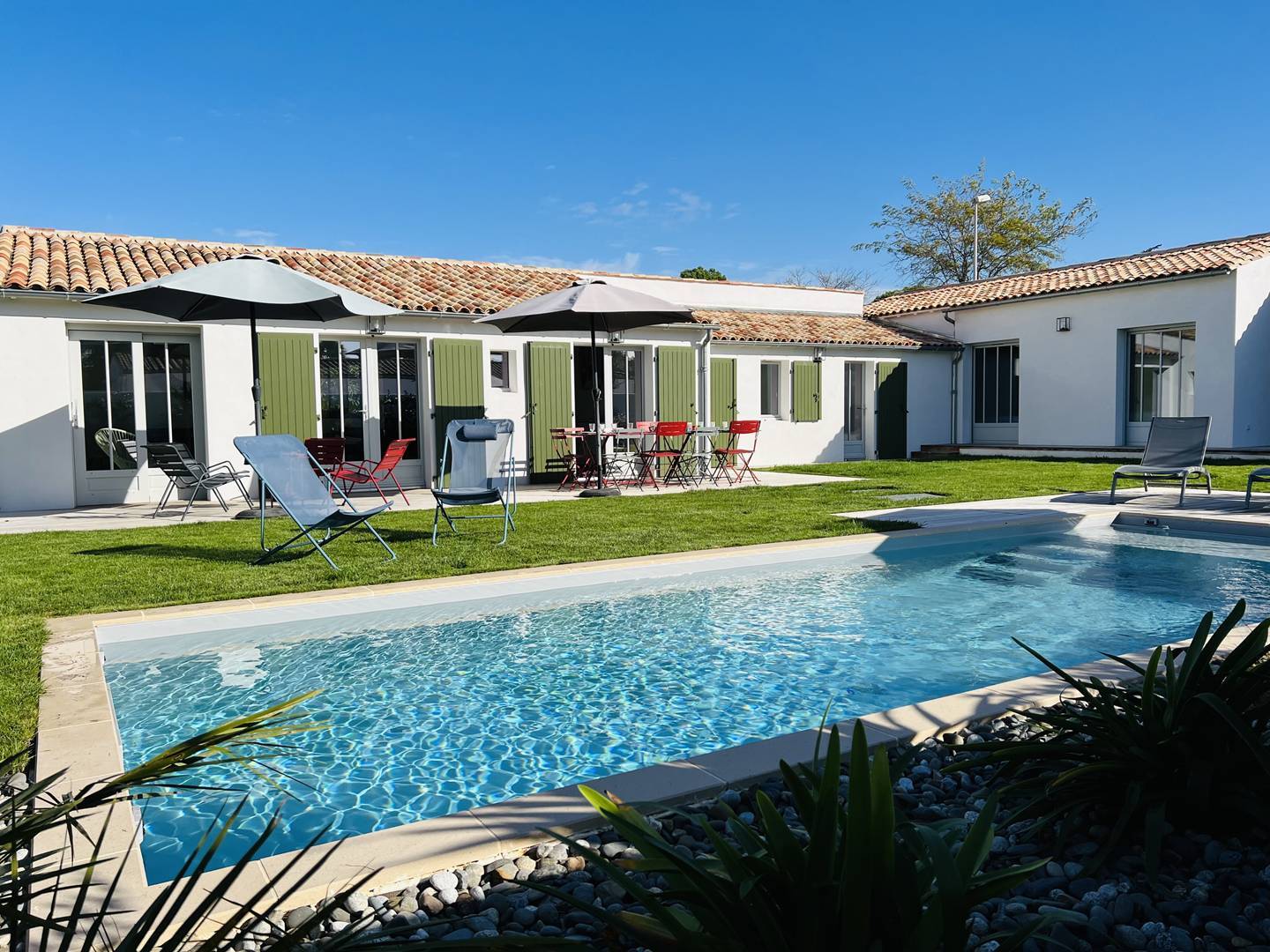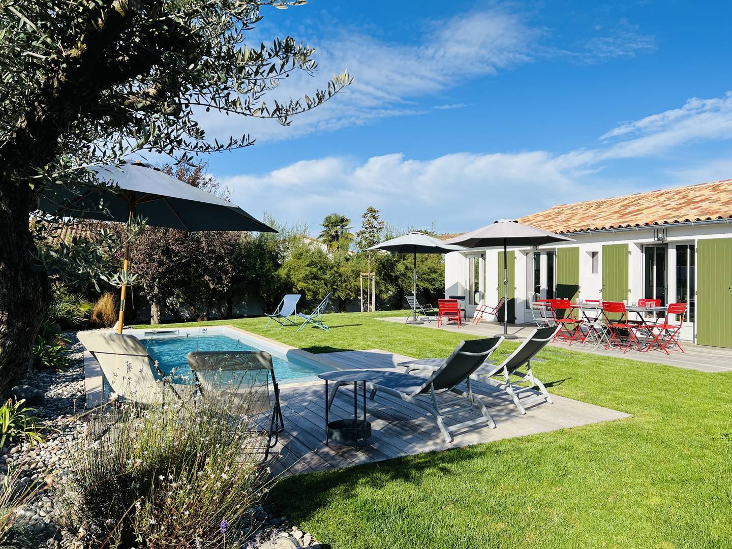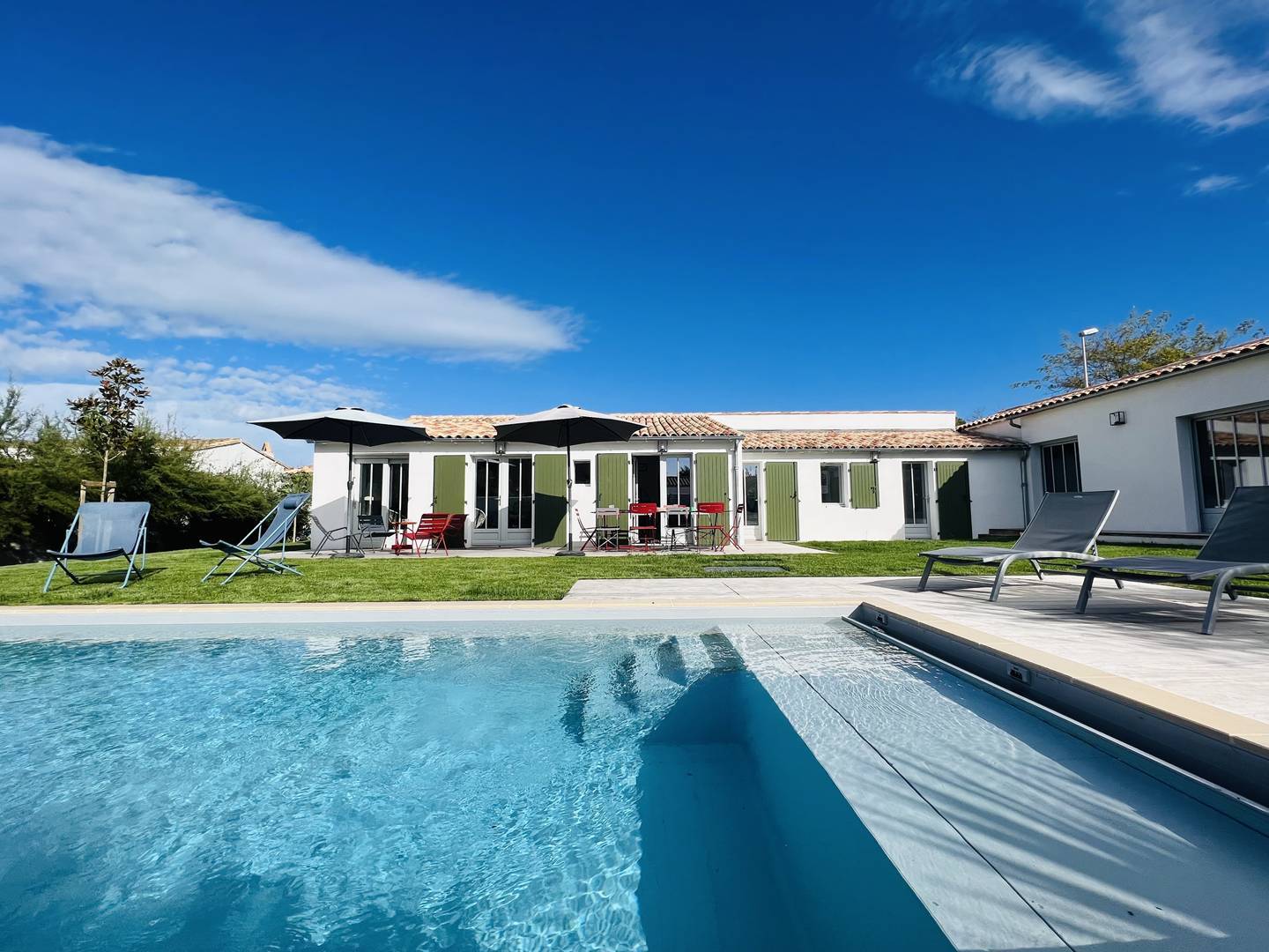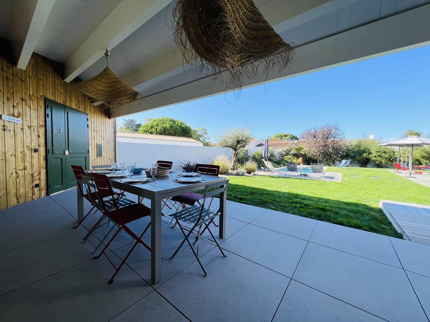 Vous apprécierez les volumes des espaces de vie ouverts sur le jardin avec terrasse, salon de jardin, préau d'été avec plancha permettant de déjeuner/dîner dehors, et espace piscine avec transats. La piscine est chauffée (d'avril à octobre selon la météo) et sécurisée par un volet électrique.