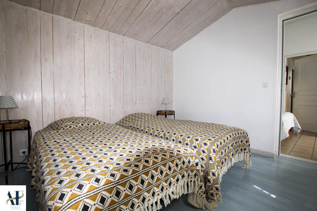 Un Séjour de 29 m² avec cuisine intégrée équipée - Cellier de 2 m² - Une Chambre de 10 m² avec 1 lit de 140, couette, placard - Salle de Douche de 3,3 m² - WC de 1,5 m² – Chambre de 10 m² avec 2 lits de 90, couettes, étagères, (accès par l'extérieur ou par la chambre parents) - Garage à vélos de 7 m² -