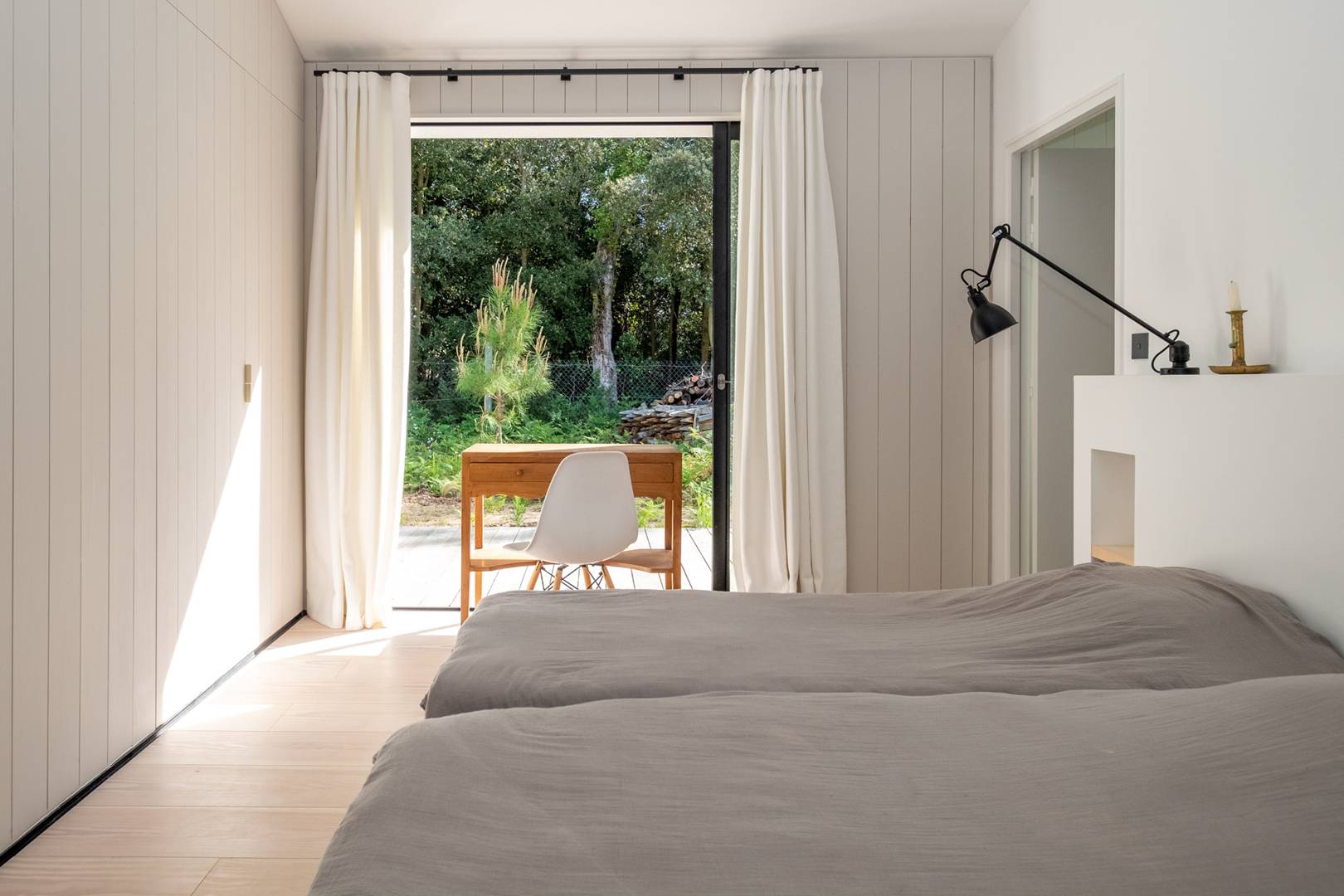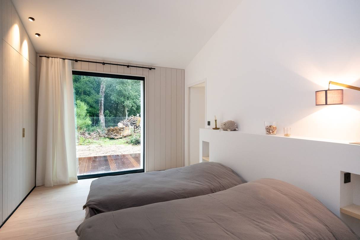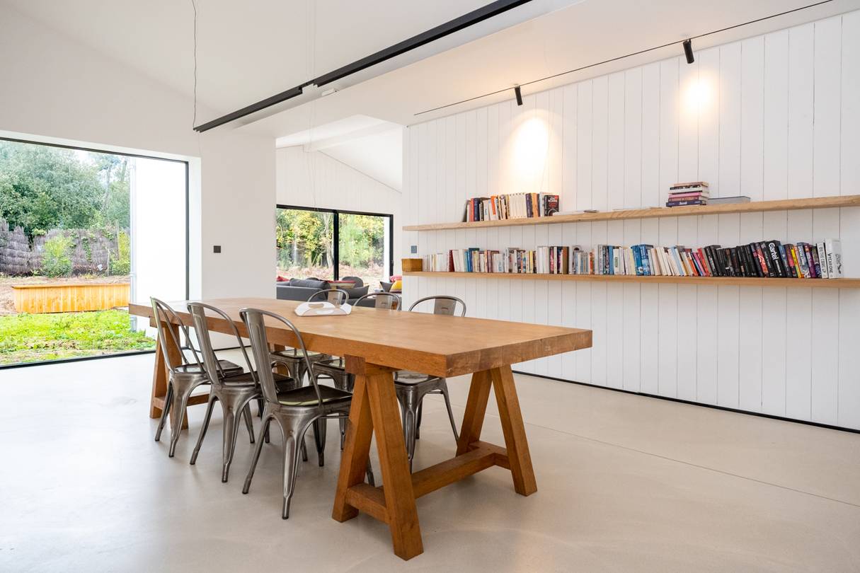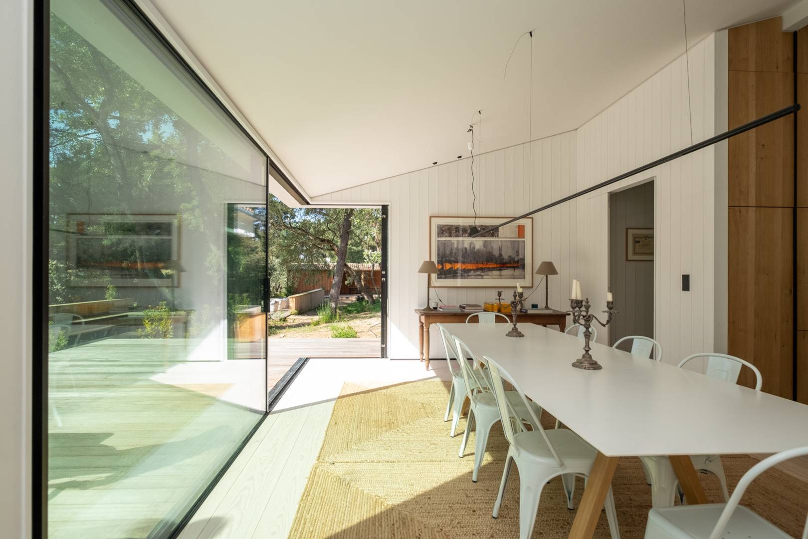La maison dispose de 5 chambres doubles et 1 chambre enfant pouvant accueillir un total de 10 adultes et 4 enfants dont chaque chambre dispose de sa salle d'eau. La maison est articulée en deux maisons communicantes permettant une cohabitation idéale pour plusieurs familles. Baignée de lumière toute la journée, ses immenses baies vitrées vous immergent dans une sensation de sérénité invitant à la méditation.