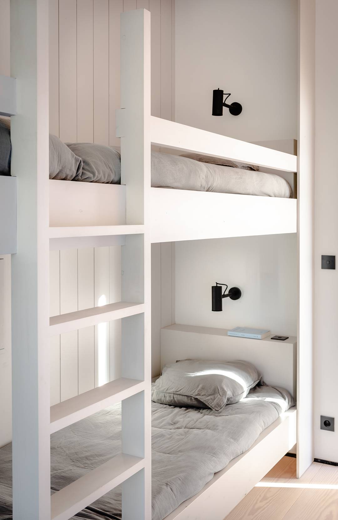 * Chambre 3 : Dortoir enfant avec 4 lits simples (2 lits superposés) avec salle de bains attenante (douche et baignoire), WC indépendant