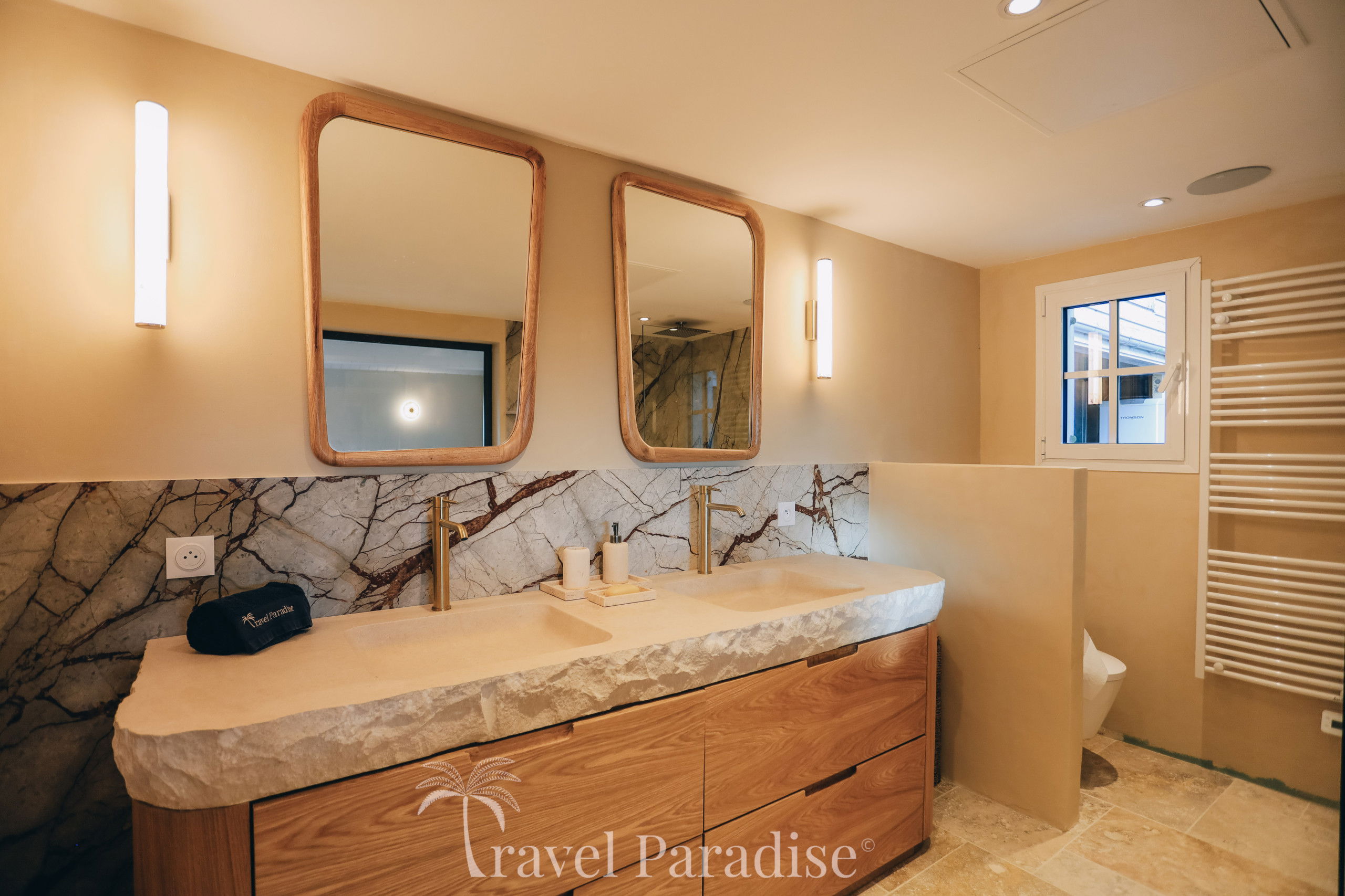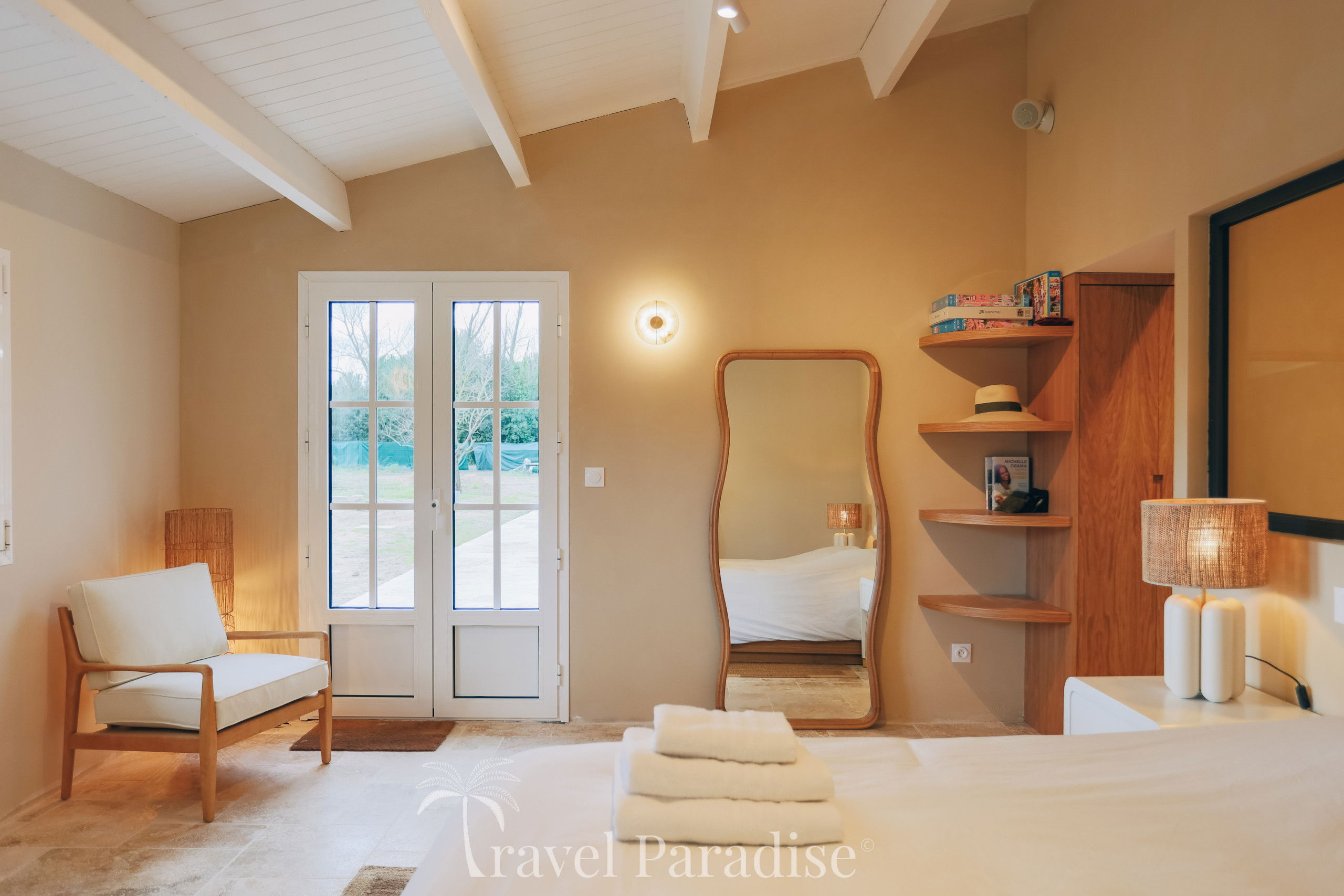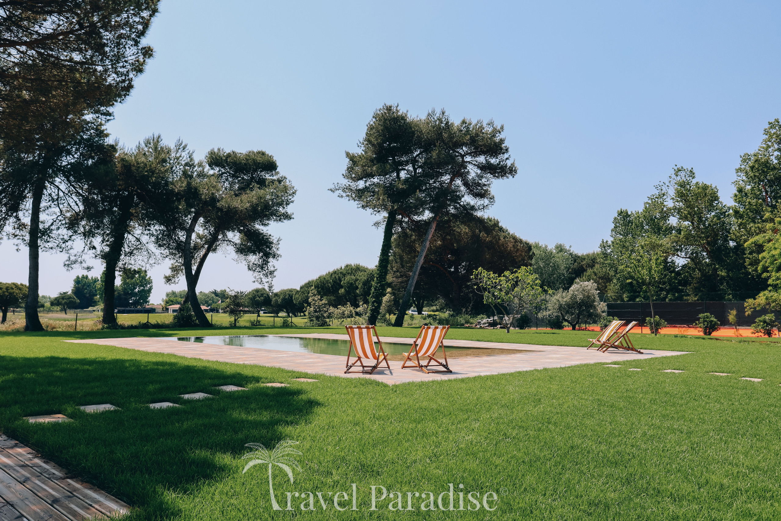 Plongez dans la piscine à débordement chauffée, dont l’effet miroir sublime le paysage environnant. Profitez des trois grandes terrasses aménagées pour des moments conviviaux sous le soleil rhétais. Pour les amateurs de bien-être, un hammam est également à votre disposition, - tandis que les passionnés de sport apprécieront le terrain de tennis privatif.