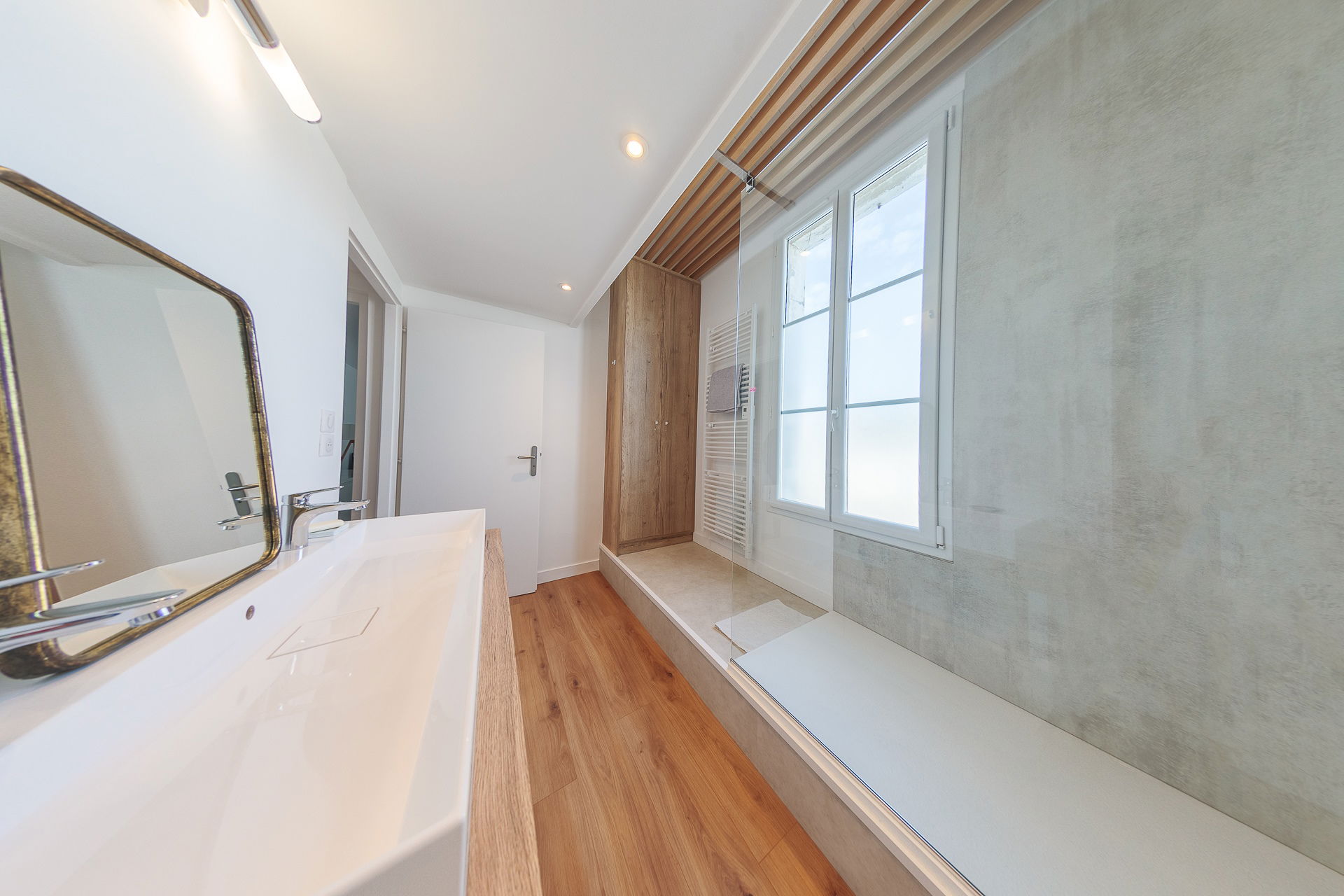 Le RDC dispose d'une chambre, une salle d'eau en parfaite harmonie et un WC.