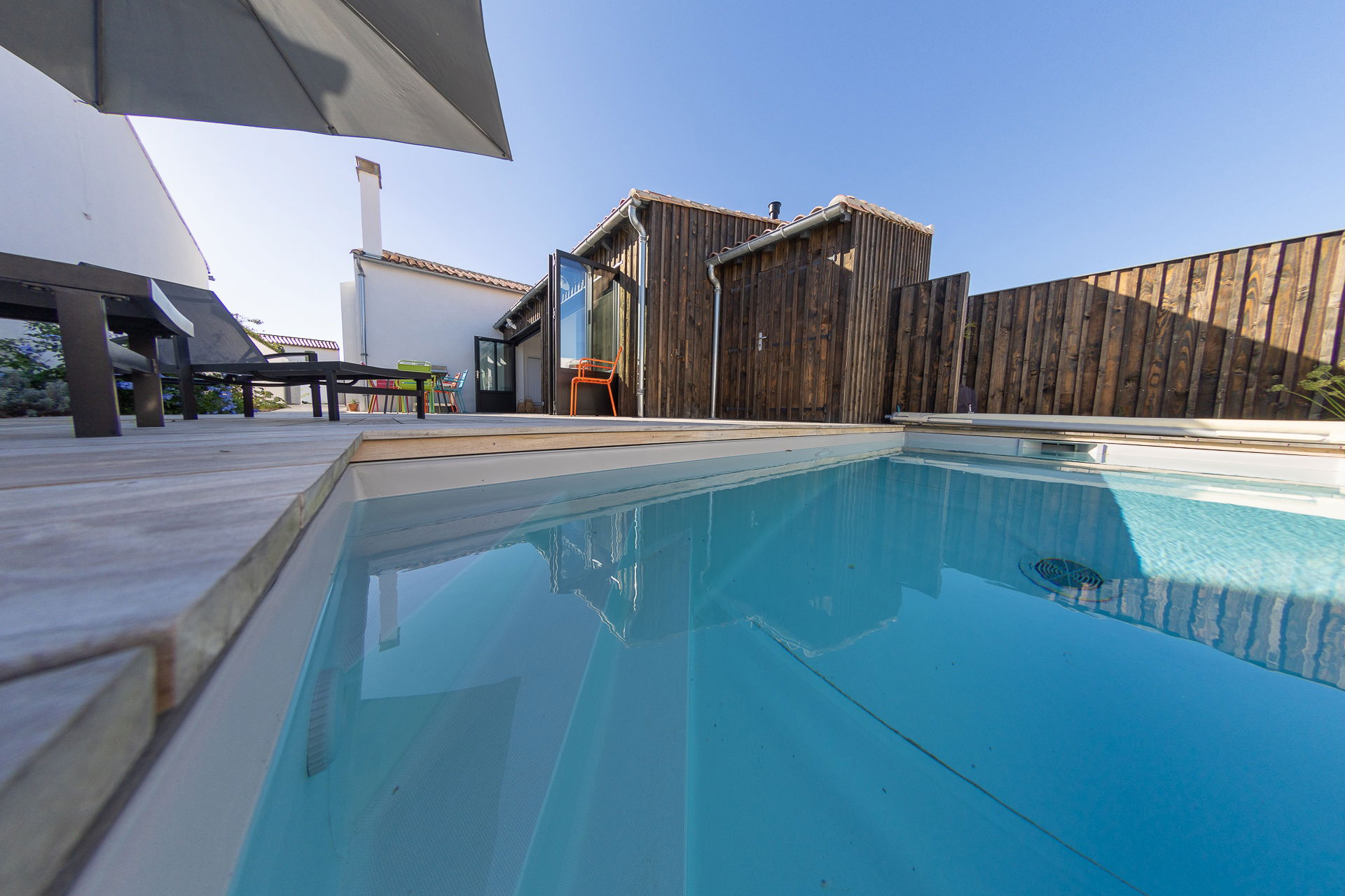 La piscine est chauffée et fait 10m2. Petit bassin avec bâche à barre homologuée.