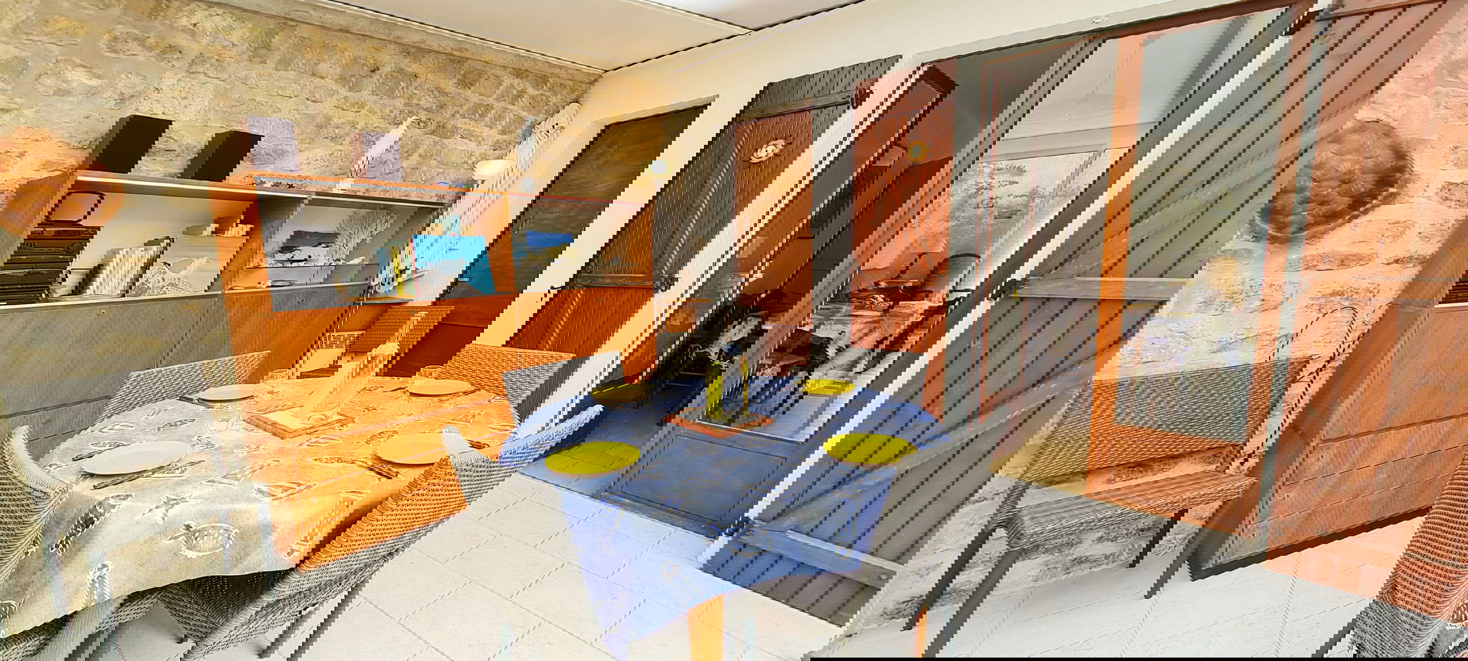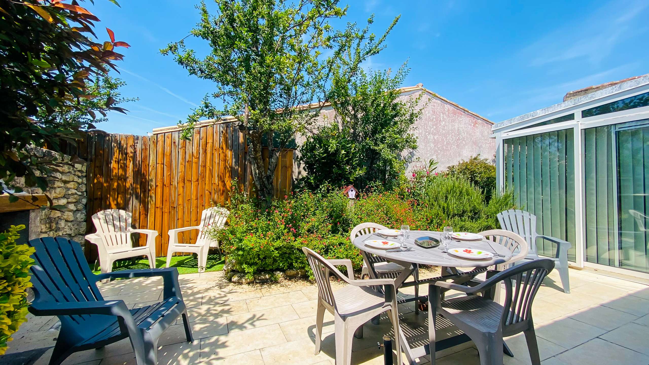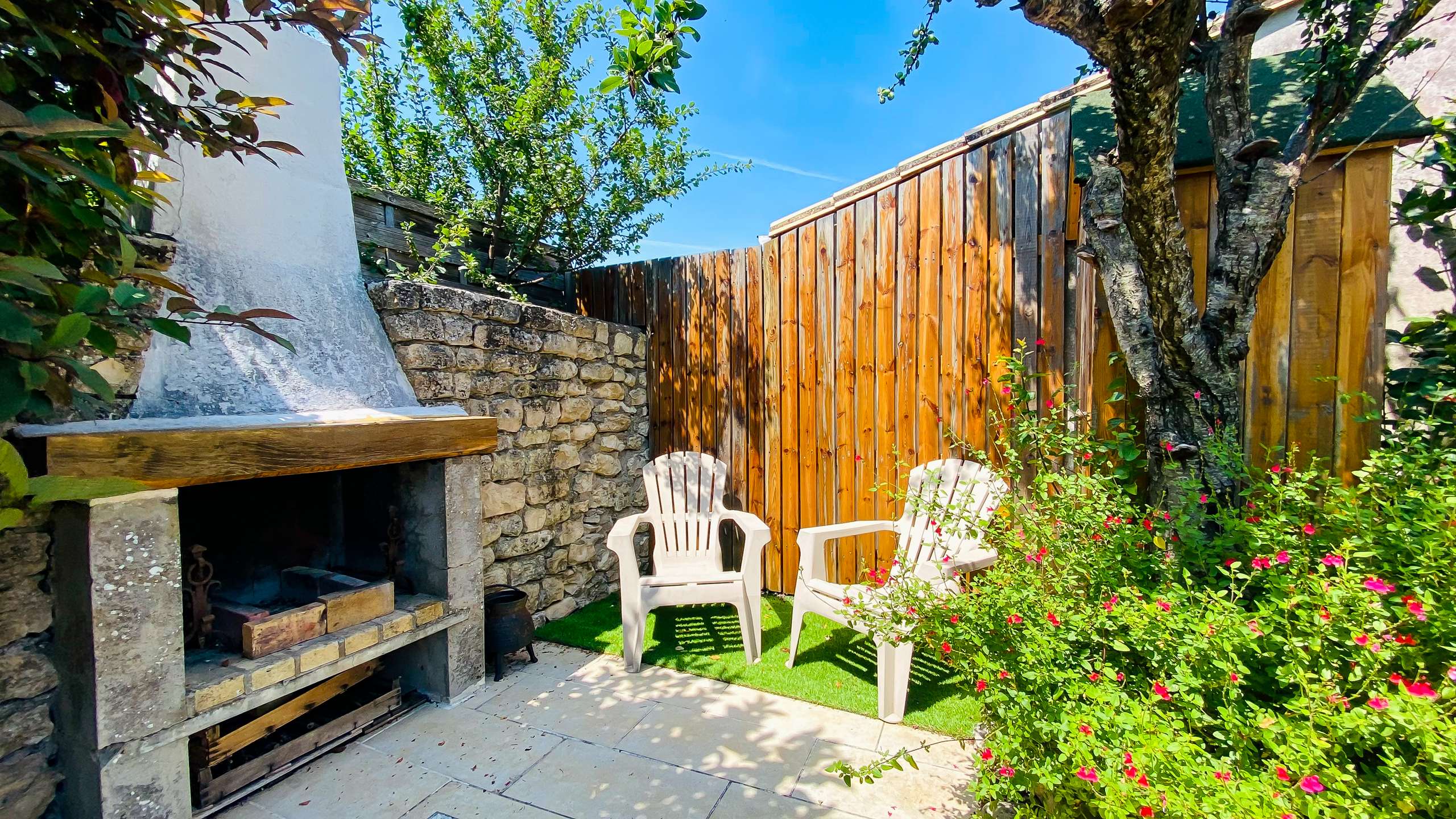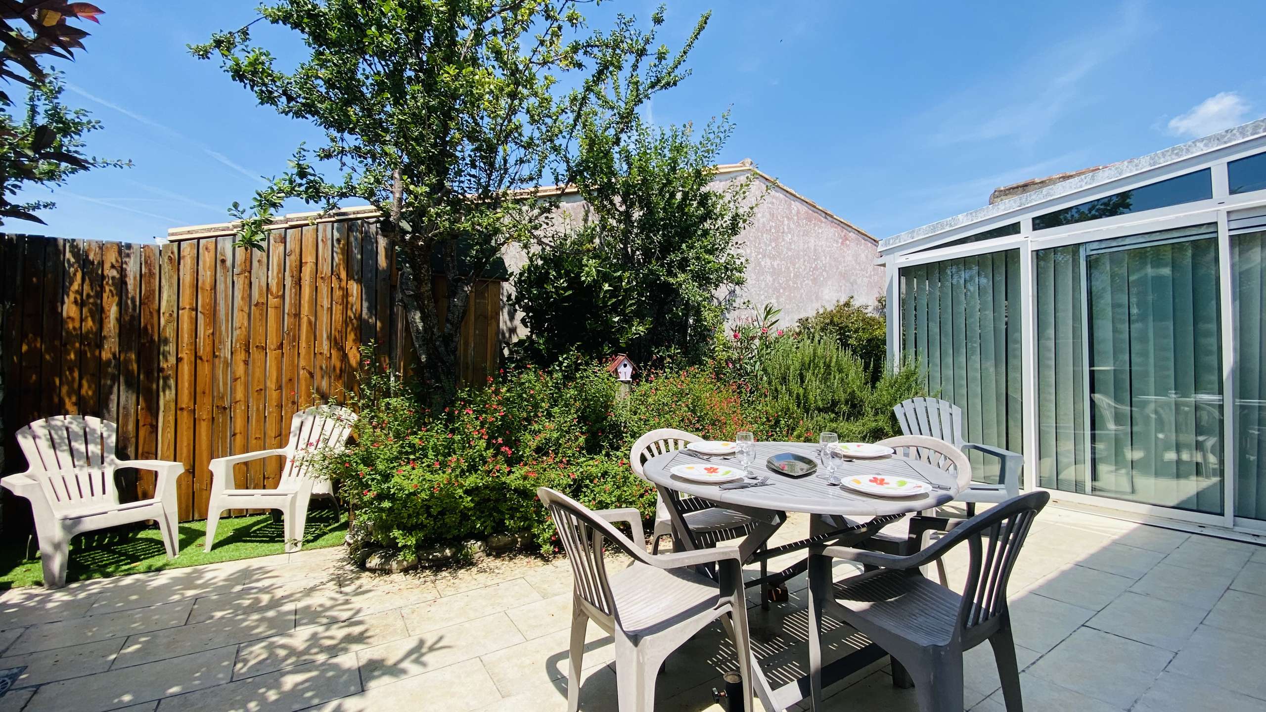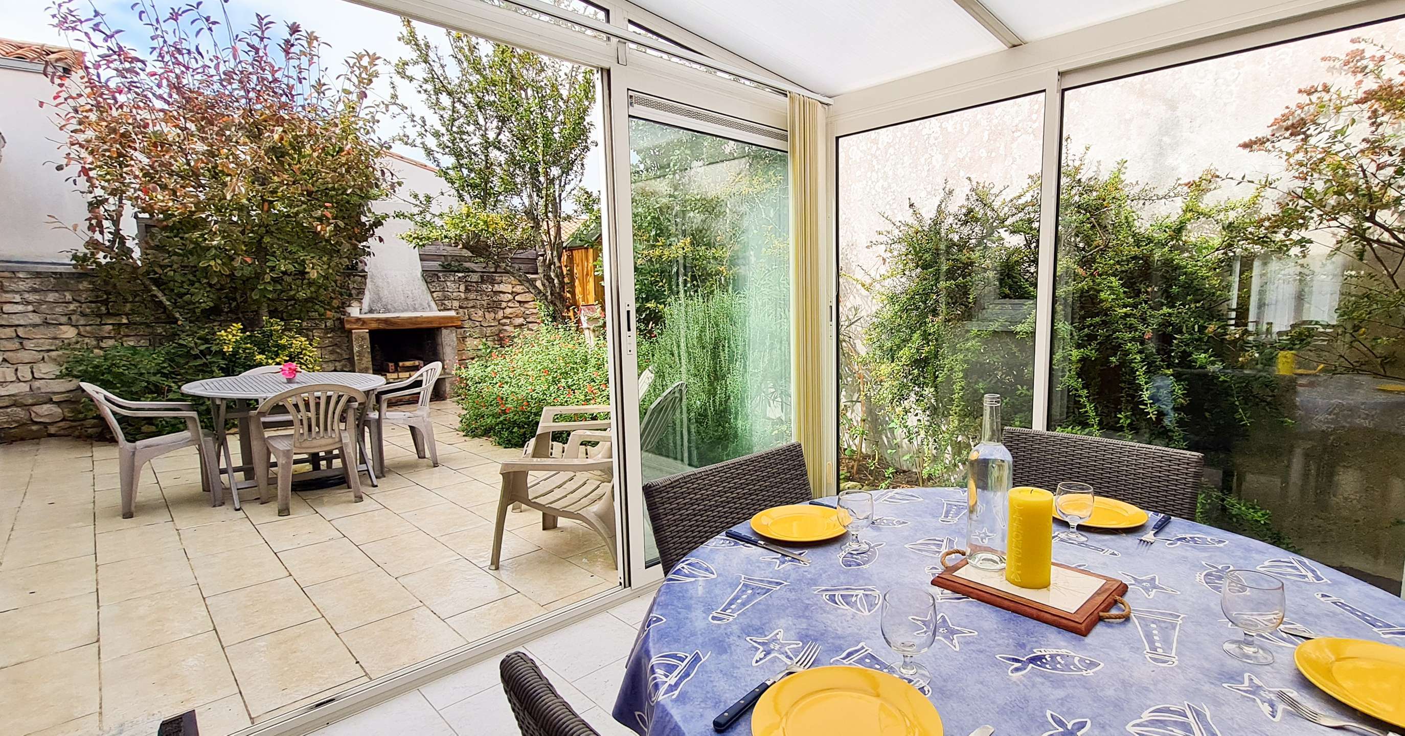 VERANDA de 14m² ouverte sur une une cour de 32m² avec table, chaises de jardin, barbecue en pierre.