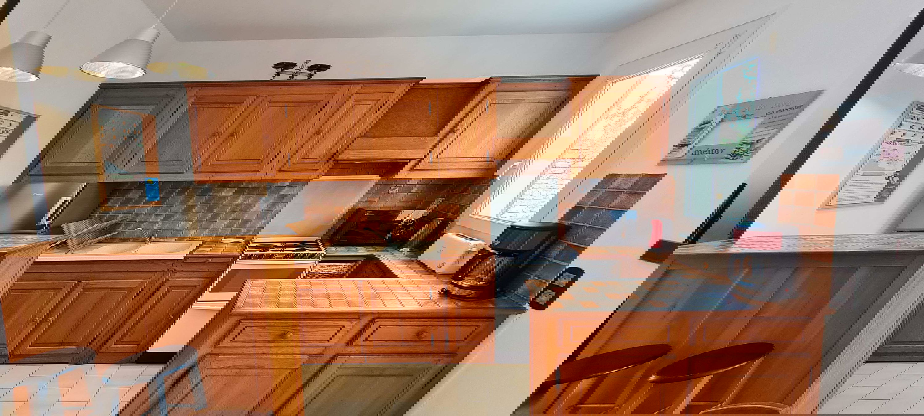 - Cuisine avec frigo et partie congélateur, plaque de cuisson (3 feux gaz, 1 feu électrique), four électrique, lave vaisselle, micro ondes, cafetière filtre et Nespresso, bouilloire et grille pain.