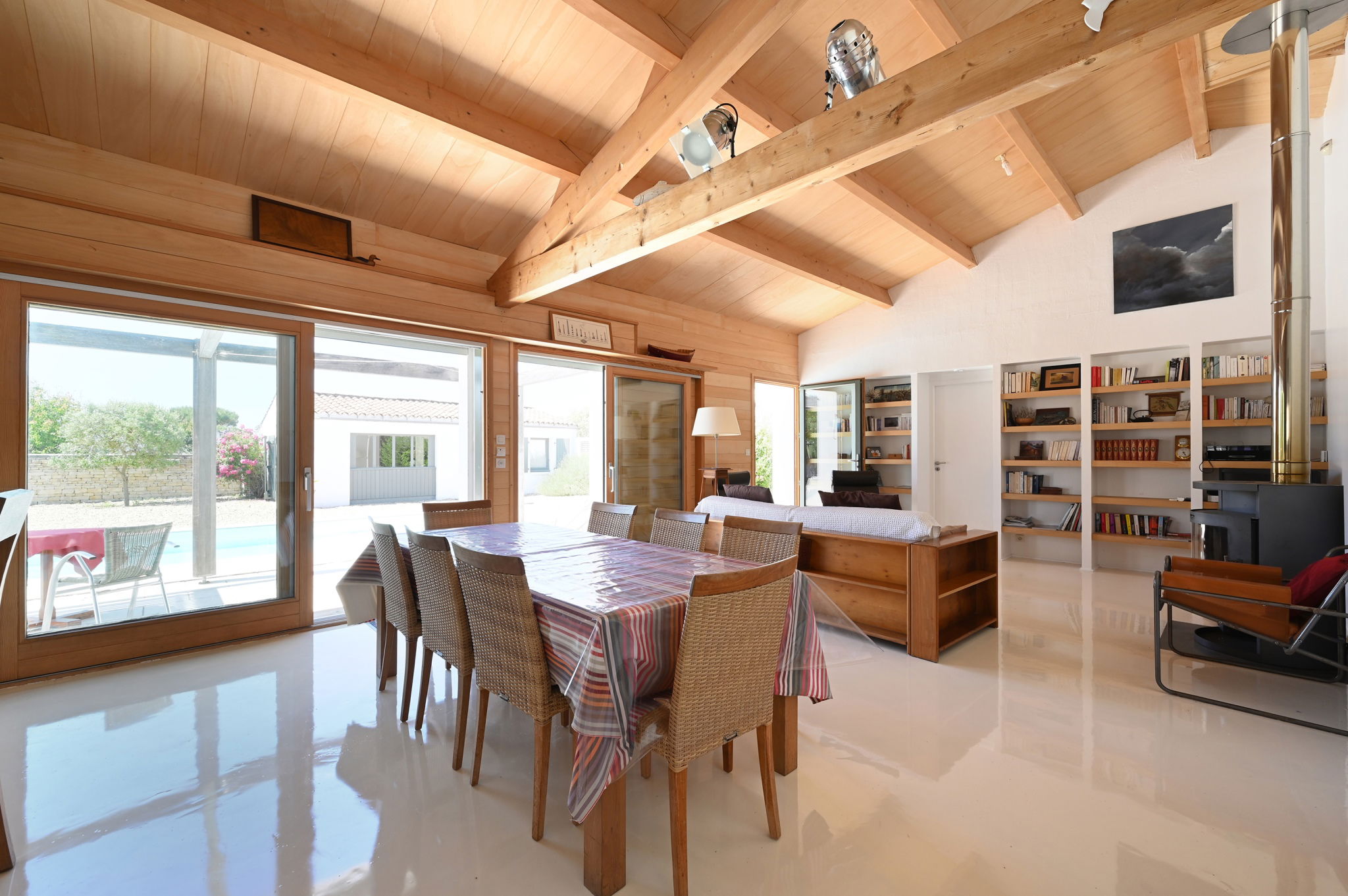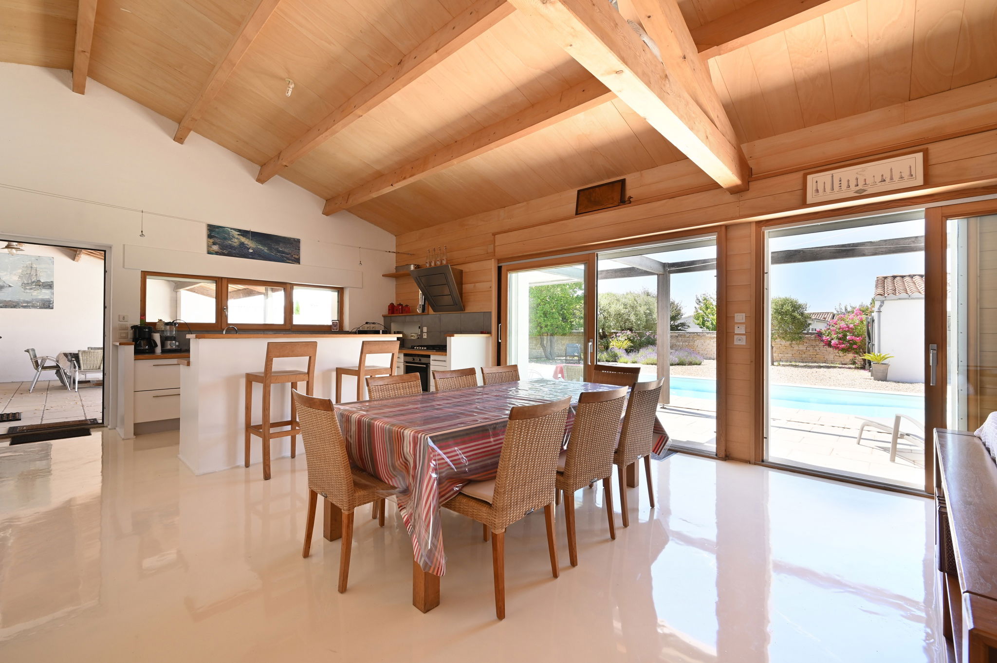 L’extérieur dispose d’une terrasse couverte avec cuisine d’été, barbecue et piscine.