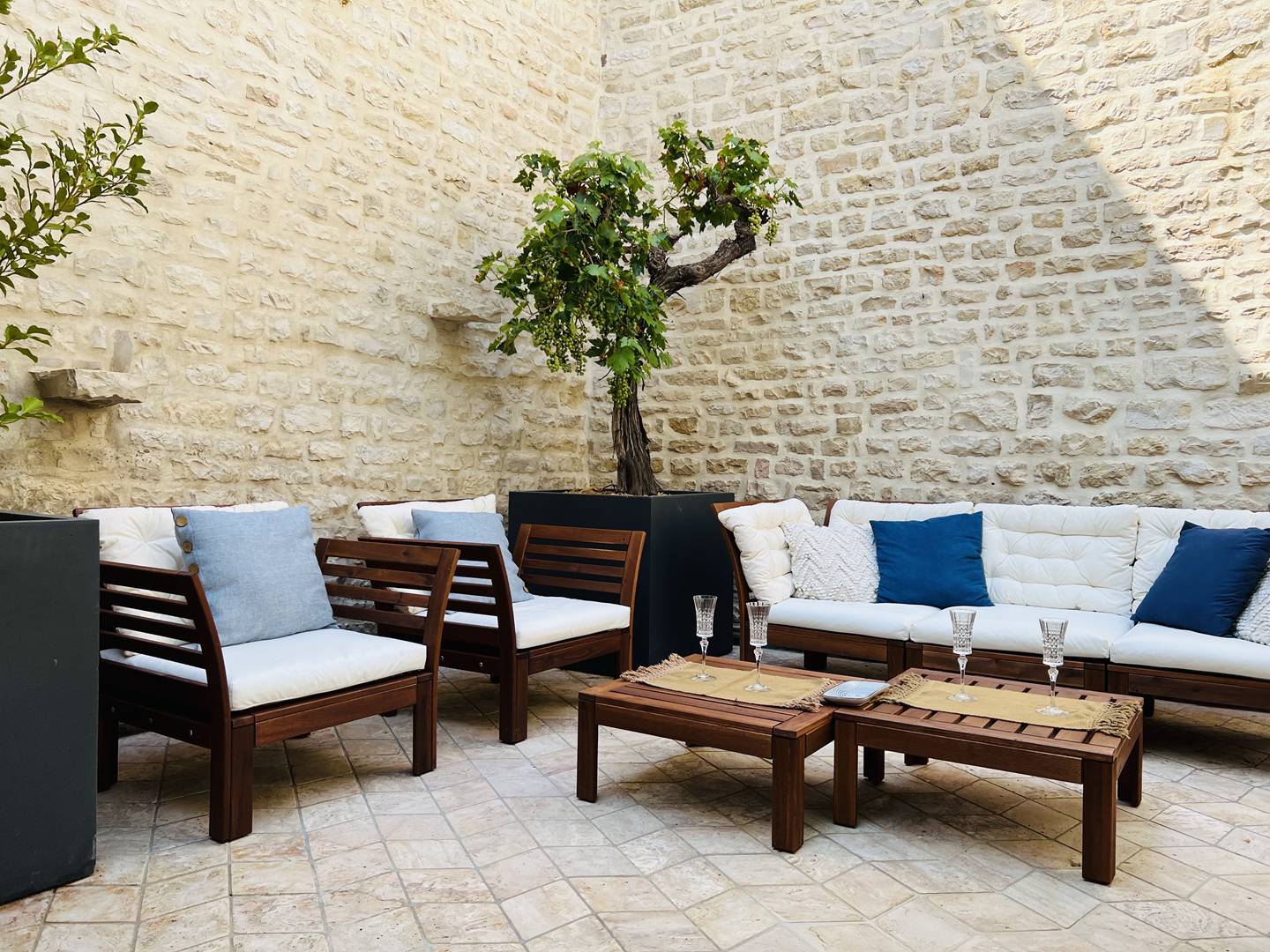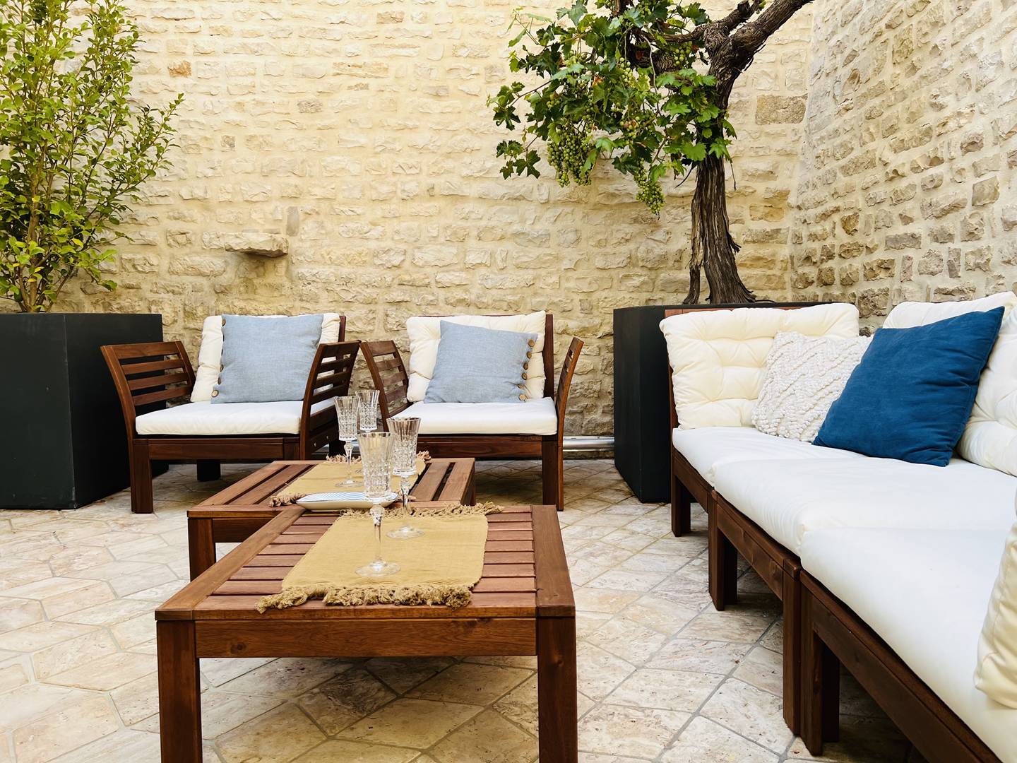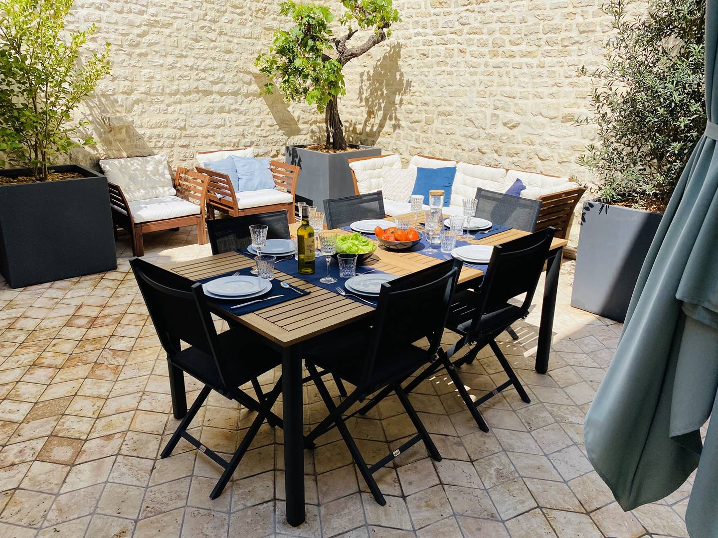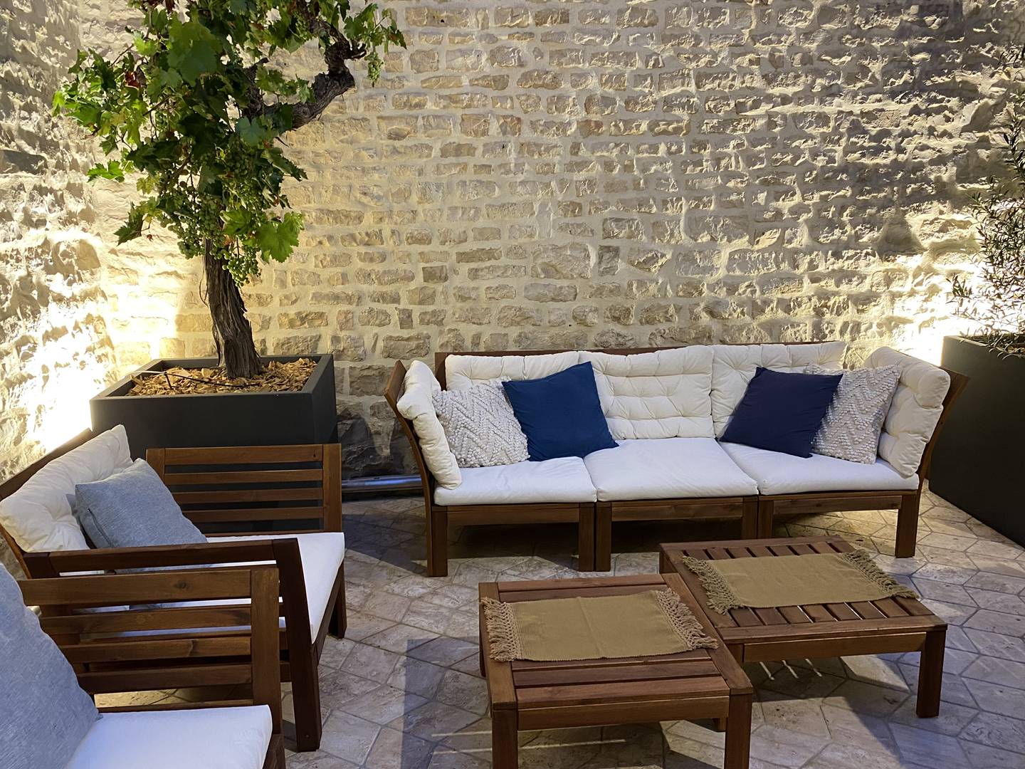 En extérieur, vous profiterez d'une belle cour aménagée avec goût. Un canapé et des fauteuils sont à votre disposition pour vous relaxer ainsi qu'une table d'extérieur et une plancha électrique pour déjeuner et dîner dehors.