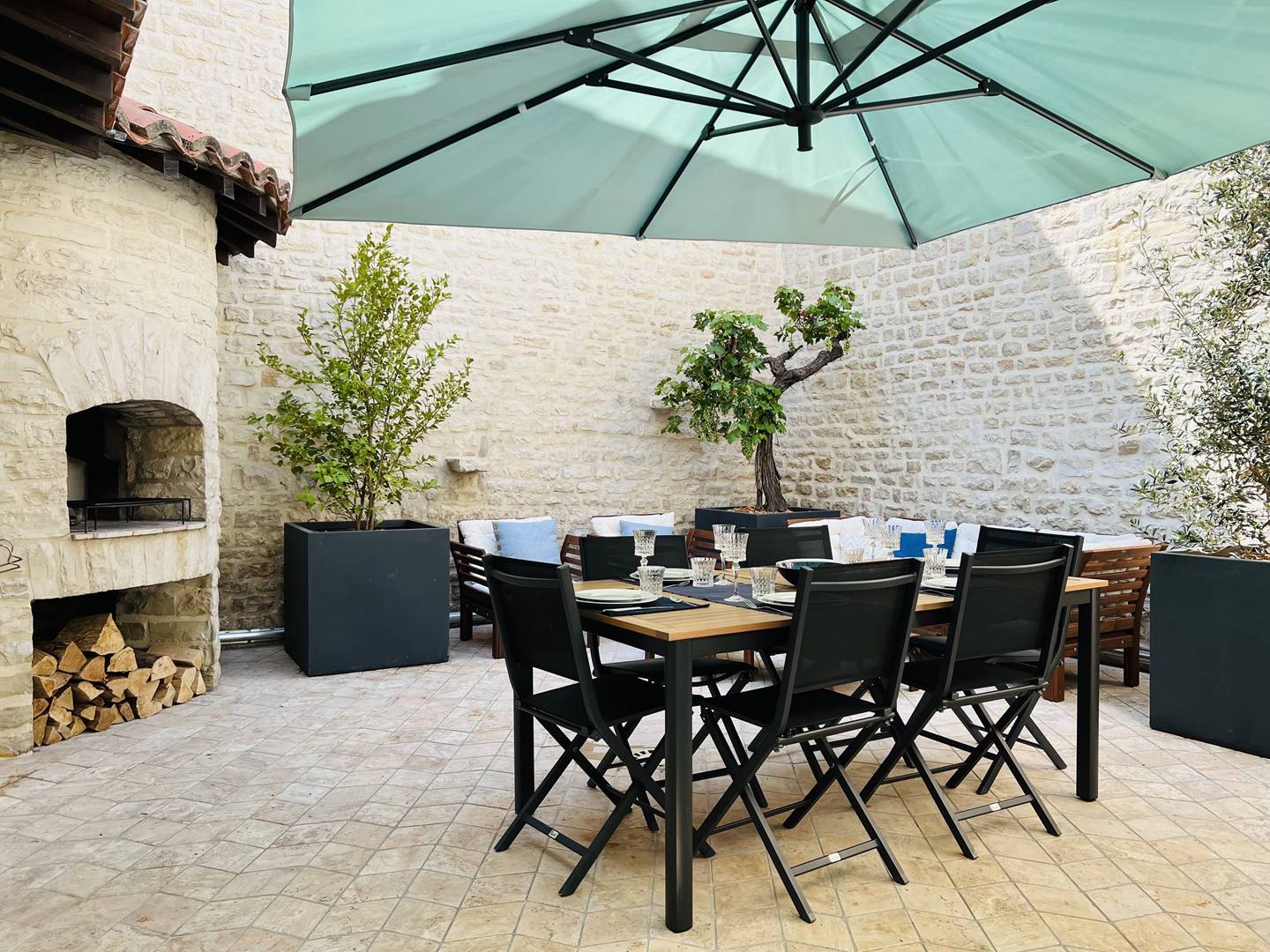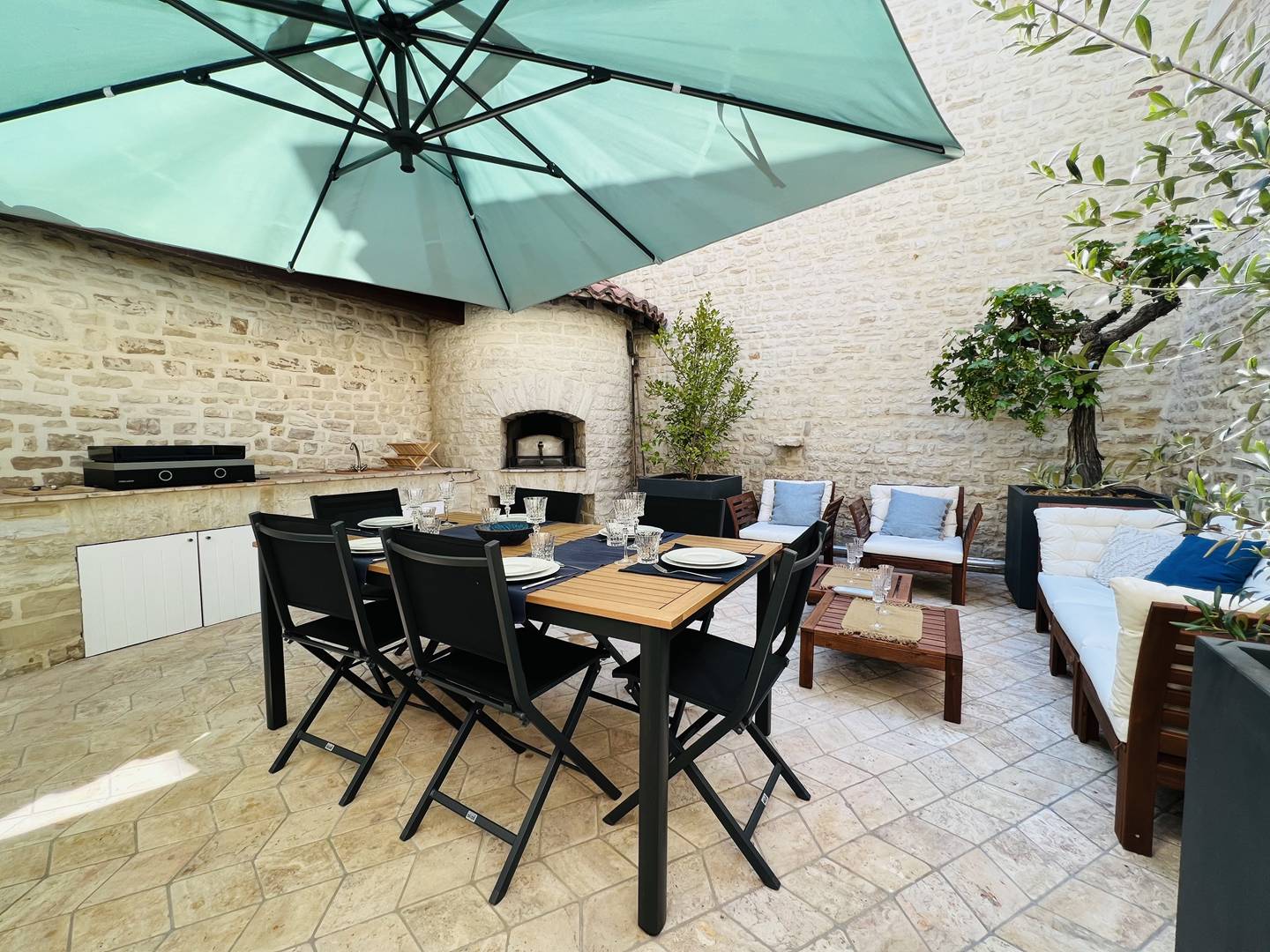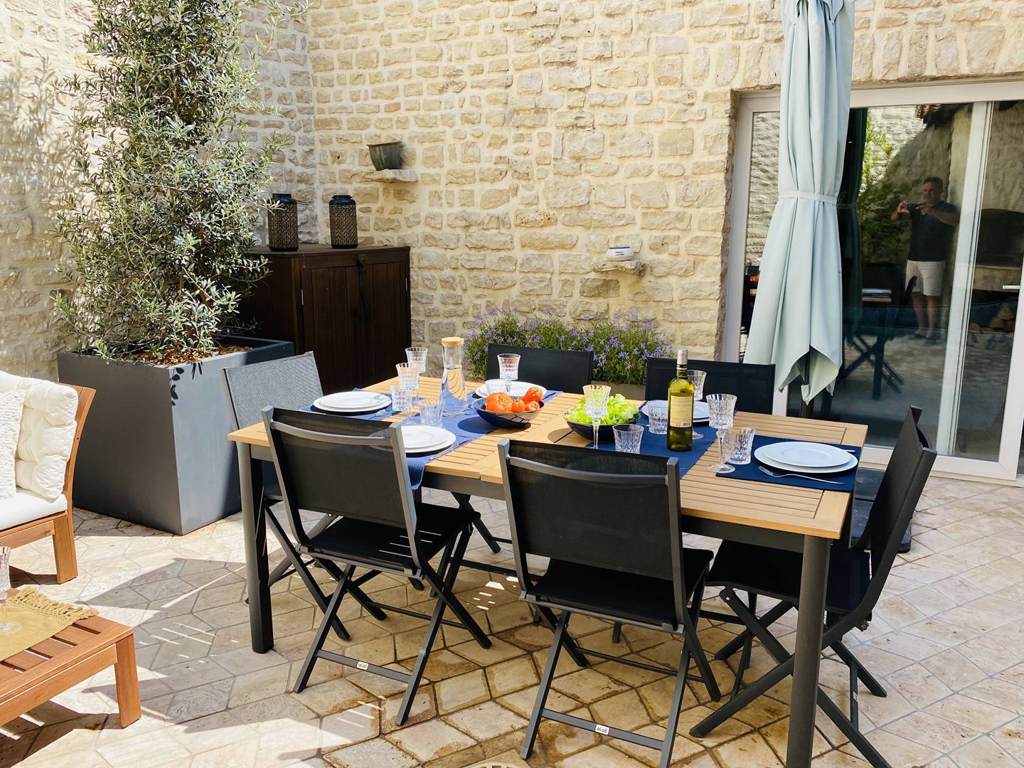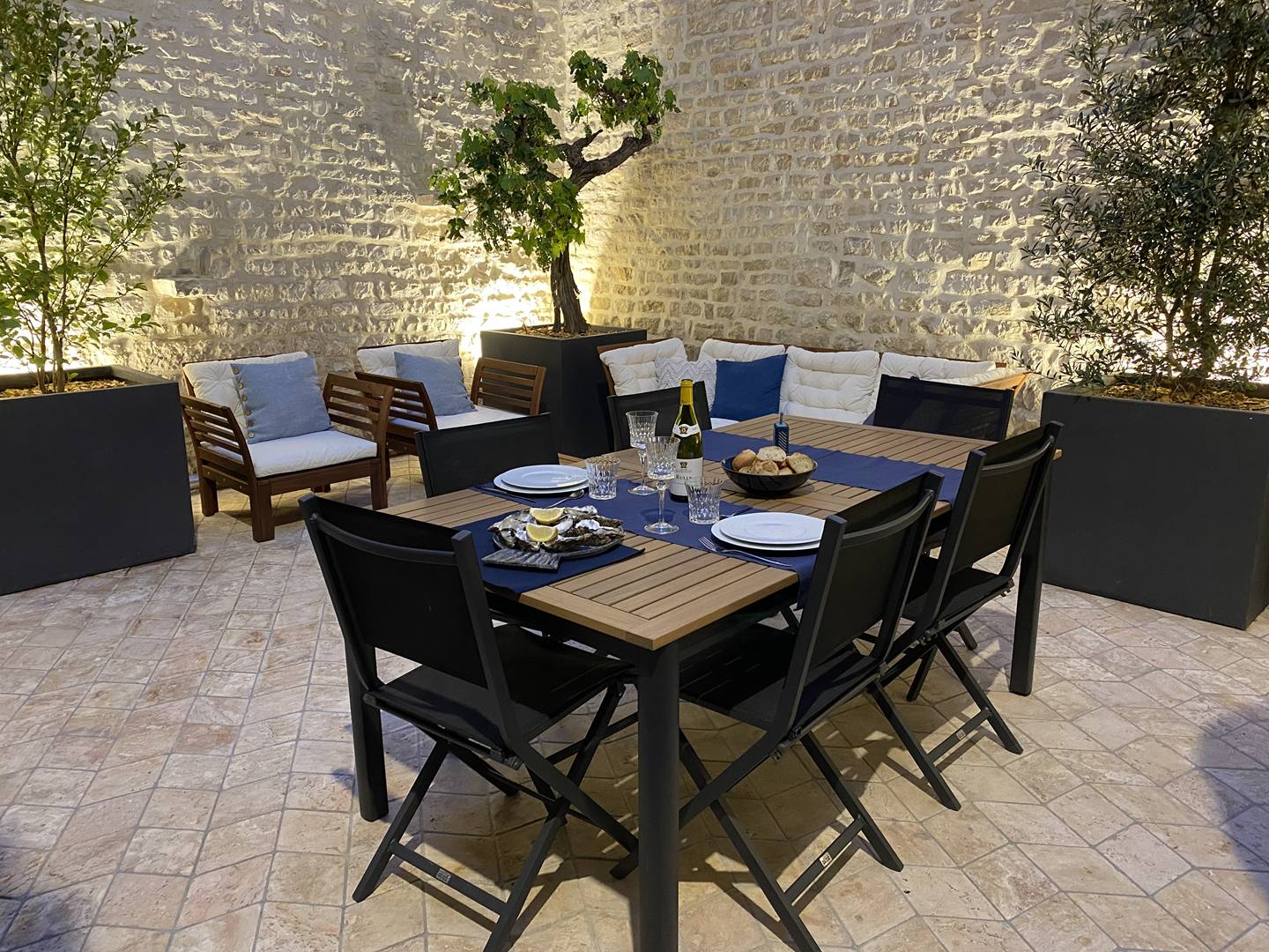 En extérieur, vous profiterez d'une belle cour aménagée avec goût. Un canapé et des fauteuils sont à votre disposition pour vous relaxer ainsi qu'une table d'extérieur et une plancha électrique pour déjeuner et dîner dehors.