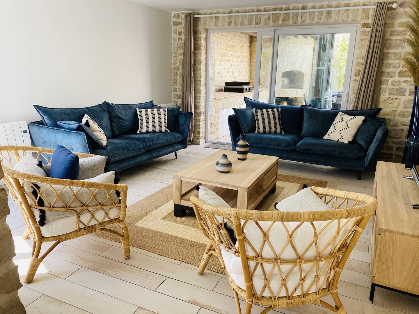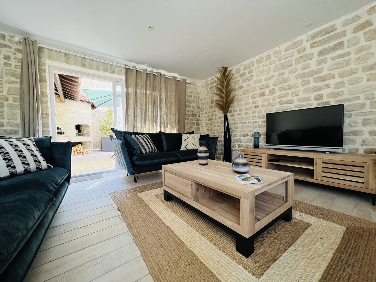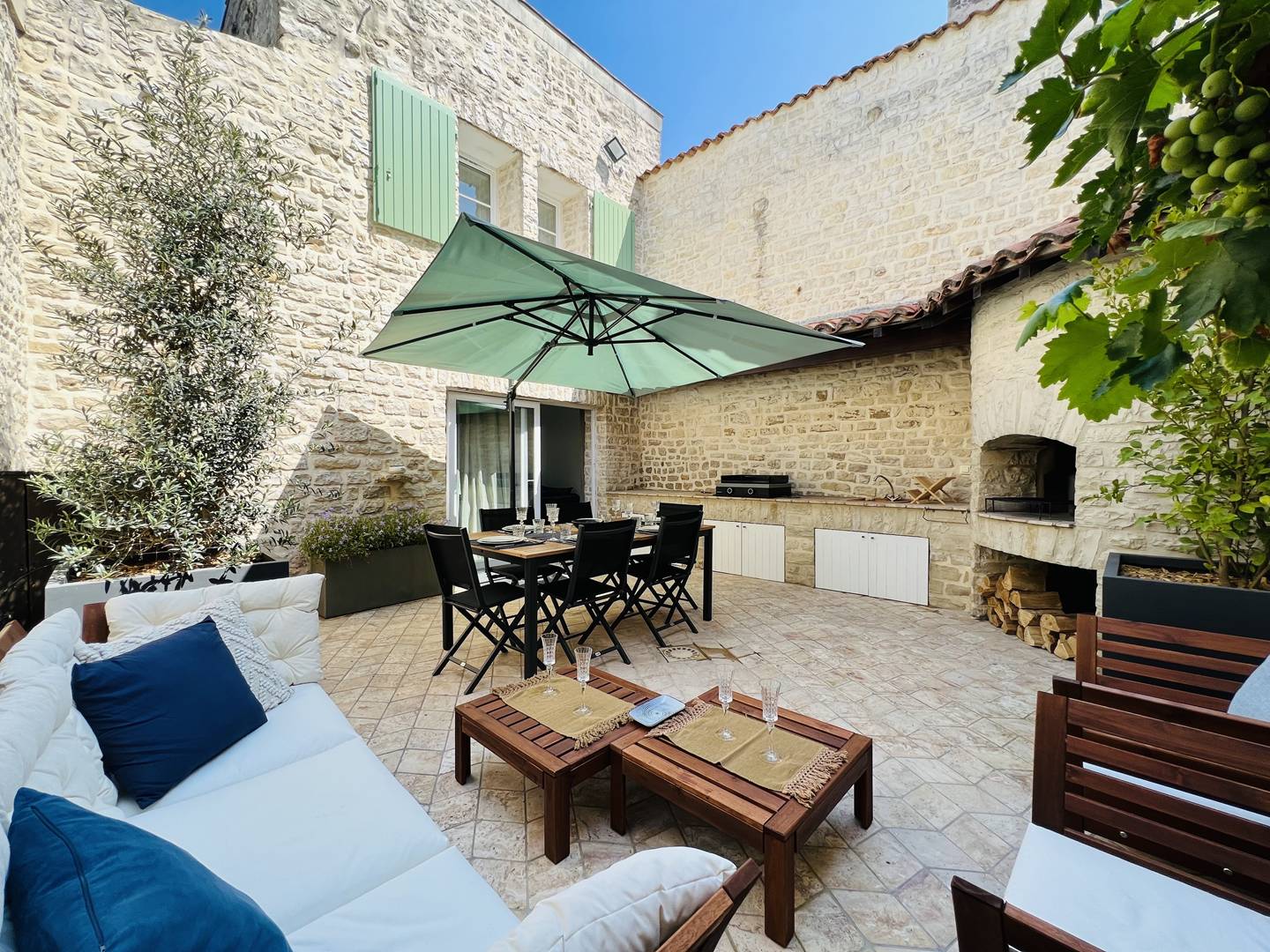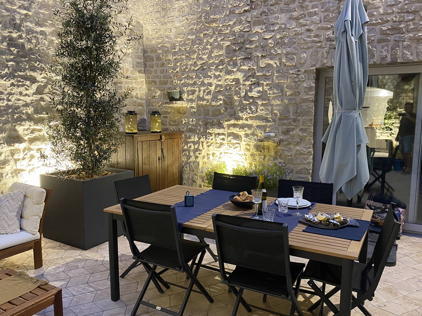 En extérieur, vous profiterez d'une belle cour aménagée avec goût. Un canapé et des fauteuils sont à votre disposition pour vous relaxer ainsi qu'une table d'extérieur et une plancha électrique pour déjeuner et dîner dehors.